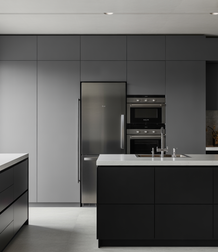 If boldness appeals, explore a tonal spectrum of grey and black. Layer different finishes—matte, satin, and brushed metal—to create depth. Add high-contrast lighting and textured countertops for a sophisticated, cinematic vibe. This layered monochrome style feels like a modern penthouse kitchen ready for entertaining.