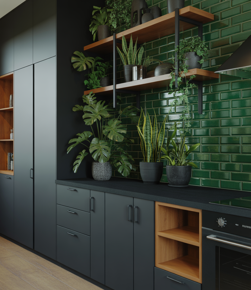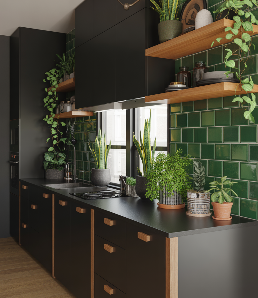Combine black architecture (cabinets, island, maybe black stainless appliances) with green and natural decor—indoor plants, green tiles, sage-toned textiles—and wood or wood-like shelving and wood and white oak details. This mix creates a stylish black kitchen that doesn’t feel cold. It feels grounded, rich in texture, and visually complex without being cluttered.