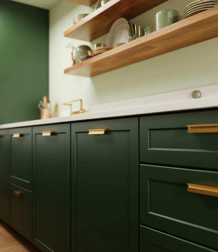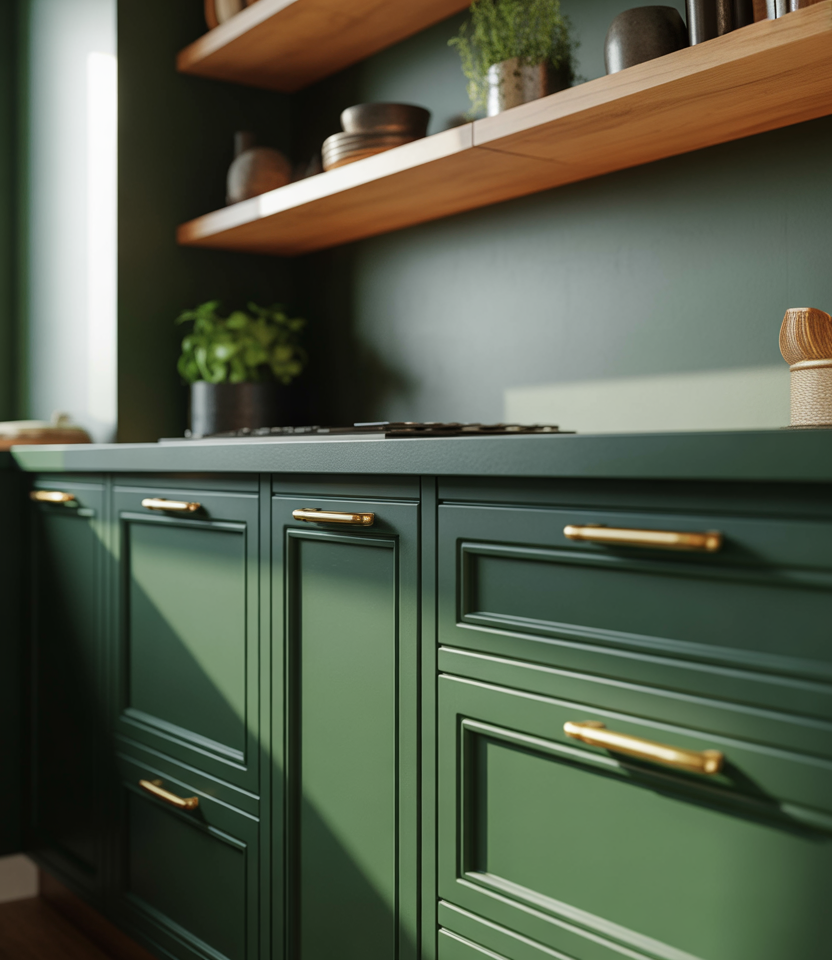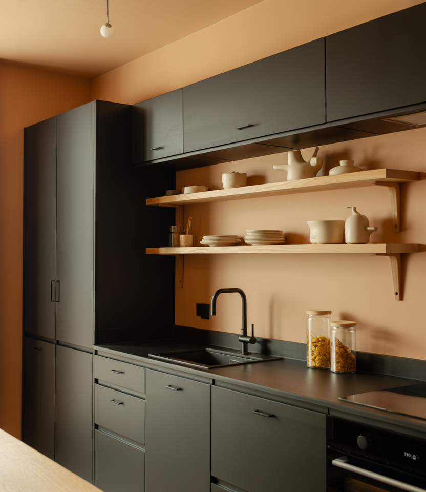 Don’t shy away from color just because you’ve chosen a dominant black base. In fact, pairing black cabinetry or surfaces with green—such as dark green lower units or a sage green backsplash—creates a rich, nature-driven aesthetic. Example: an otherwise black kitchen with dark green lower cabinets and black upper cabinets, wood open shelving, and brass hardware mixes drama with organic warmth.