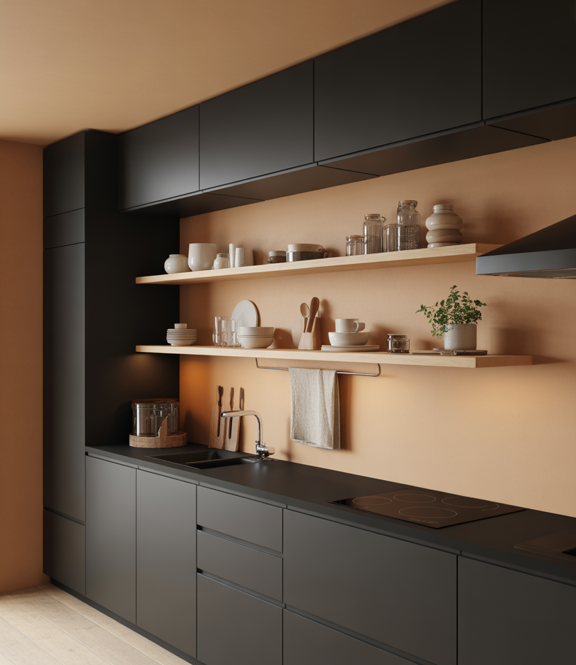 In 2026, the combination of black cabinetry with beige and light wood textures creates a blend of Nordic calm and city chic. The effect is serene but modern in spirit—clean lines, light wood shelving, and organic decor accents balance the dark base. Add soft lighting and neutral hardware for a kitchen that feels effortlessly stylish and livable.
