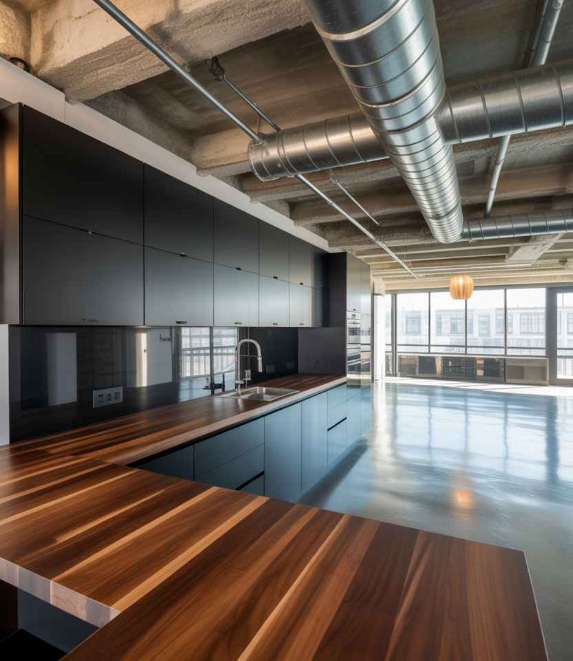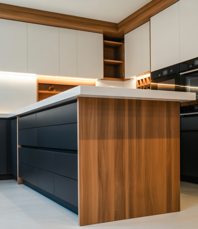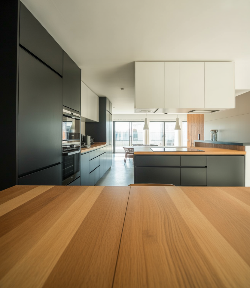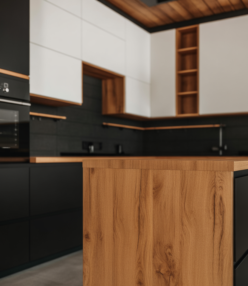 Another dramatic idea is pairing black and white cabinetry—maybe black on the island and white on the perimeter—and topping it off with a warm wood countertop (or white oak) for contrast. The white keeps it bright, the black grounds it, and the wood adds warmth and texture. This style is especially fitting for open‐plan living where kitchen and dining or lounge spaces combine.