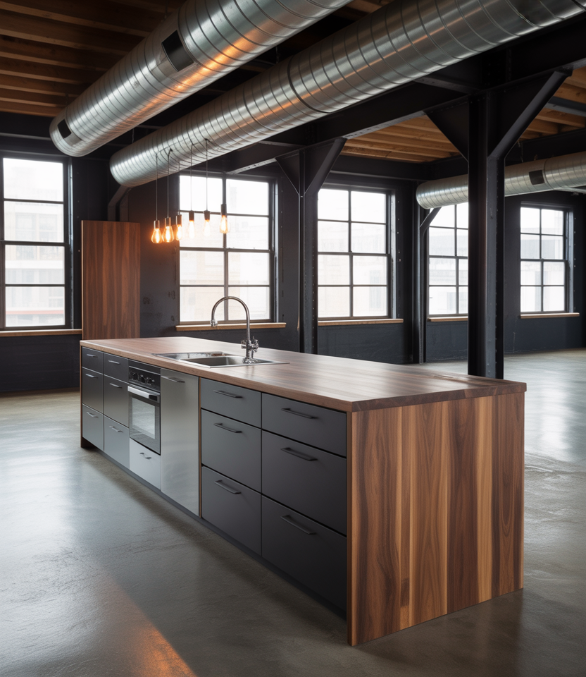 Industrial interiors are making a return, and the wood countertop has a dramatic foil in black steel accents. Combine black metal shelving, concrete countertops, and reclaimed wood and accents for a genuine loft appearance. Edison bulbs, exposed ducting, and brushed-nickel appliances complete this edgy but functional design.