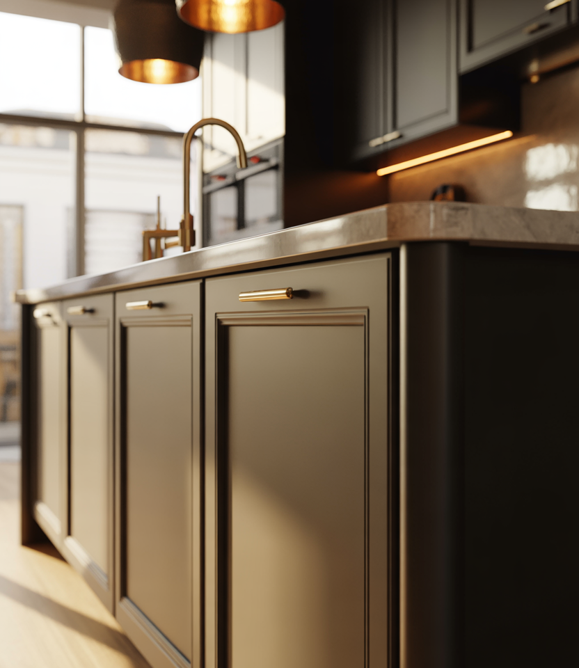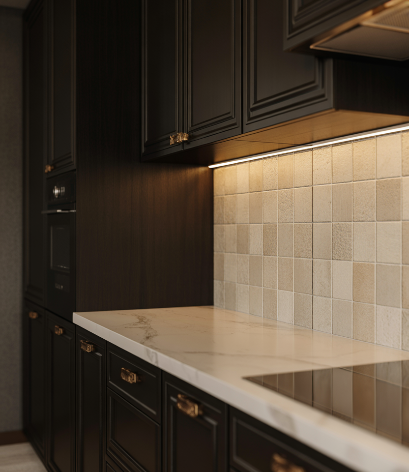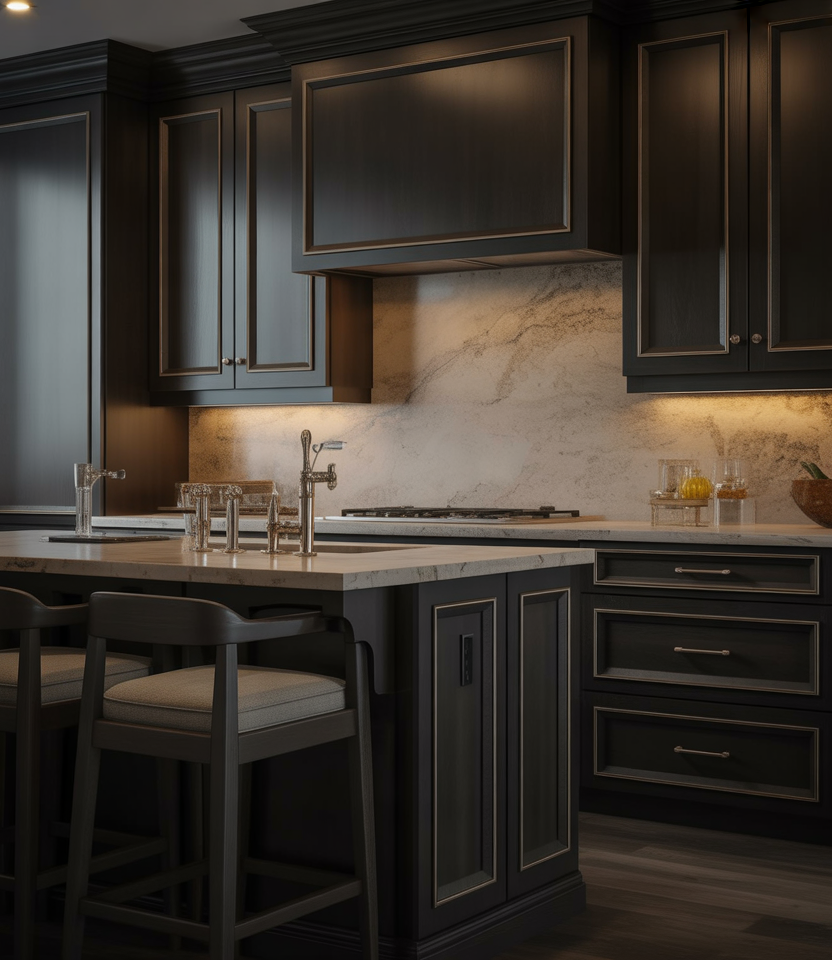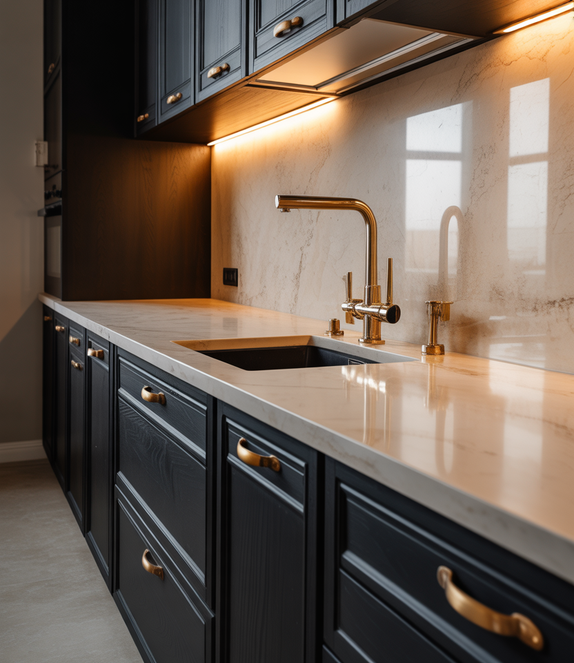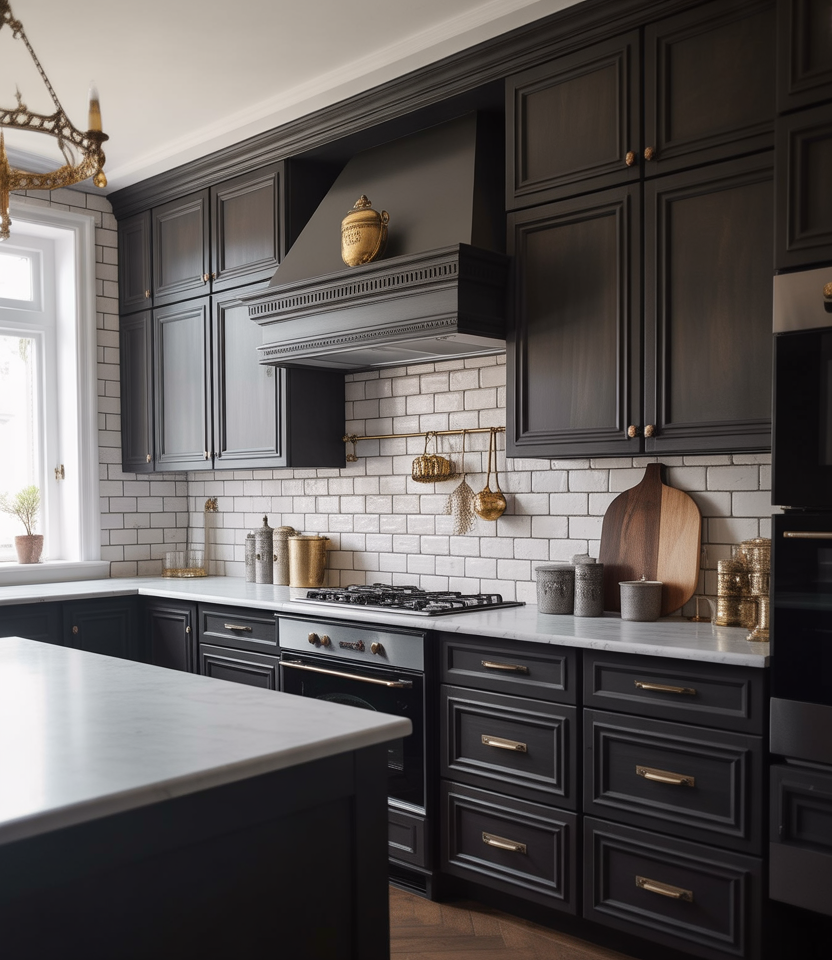 Combine taupe and black cabinetry with gold hardware and fixtures for subtle glamour. A matte black island anchors the space, while champagne-gold pendants and light decor soften the mood. This 2026 trend proves that elegance doesn’t need to shout—it whispers luxury through restrained contrast.
