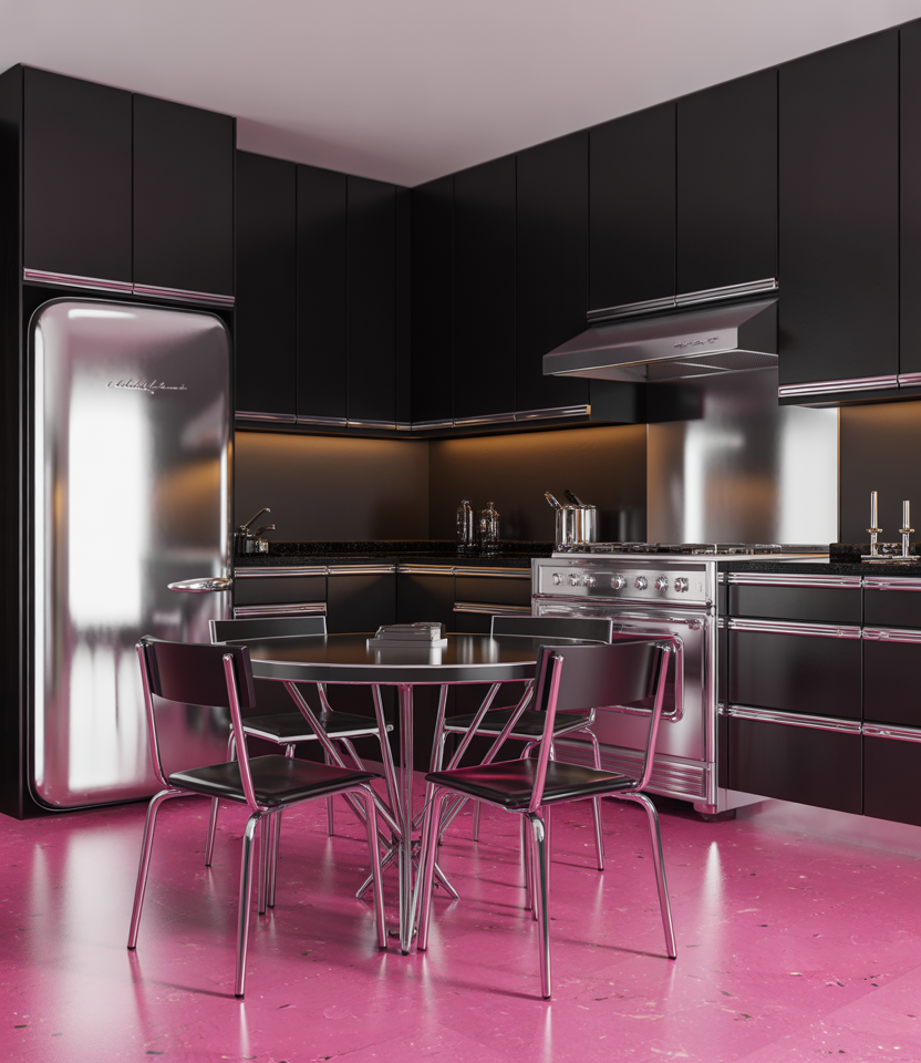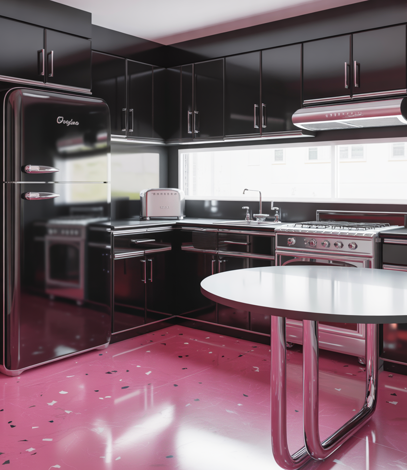 Achieve mid-century optimism through the pink and black combination. Think black gloss cabinets, pink terrazzo floors, or pastel tile backsplashes. Add chrome appliances and a curvy table to evoke that retro diner ambiance. It’s retro without being kitschy—especially when balanced by matte finishes or low-key decor items.