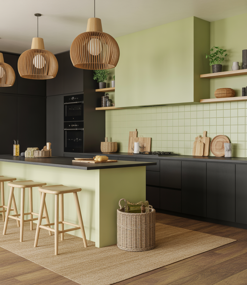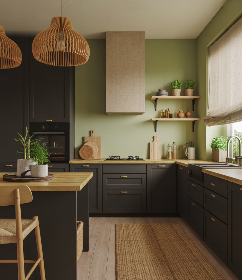 Earthy tones rule 2026 interiors. Pair a black base with sage green cabinetry or walls, woven textiles, and clay-based accents. Rattan light shades, jute rugs, and wood stools soften the scheme. With sustainable materials trending, this design reflects eco-friendly luxury while feeling timelessly grounded.