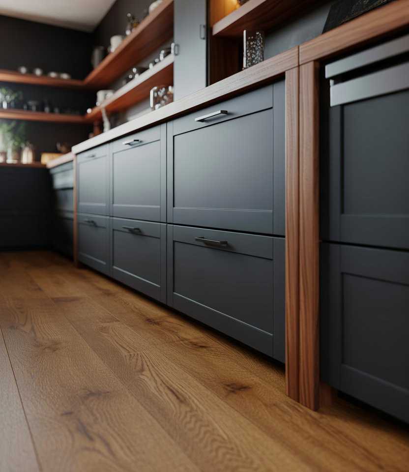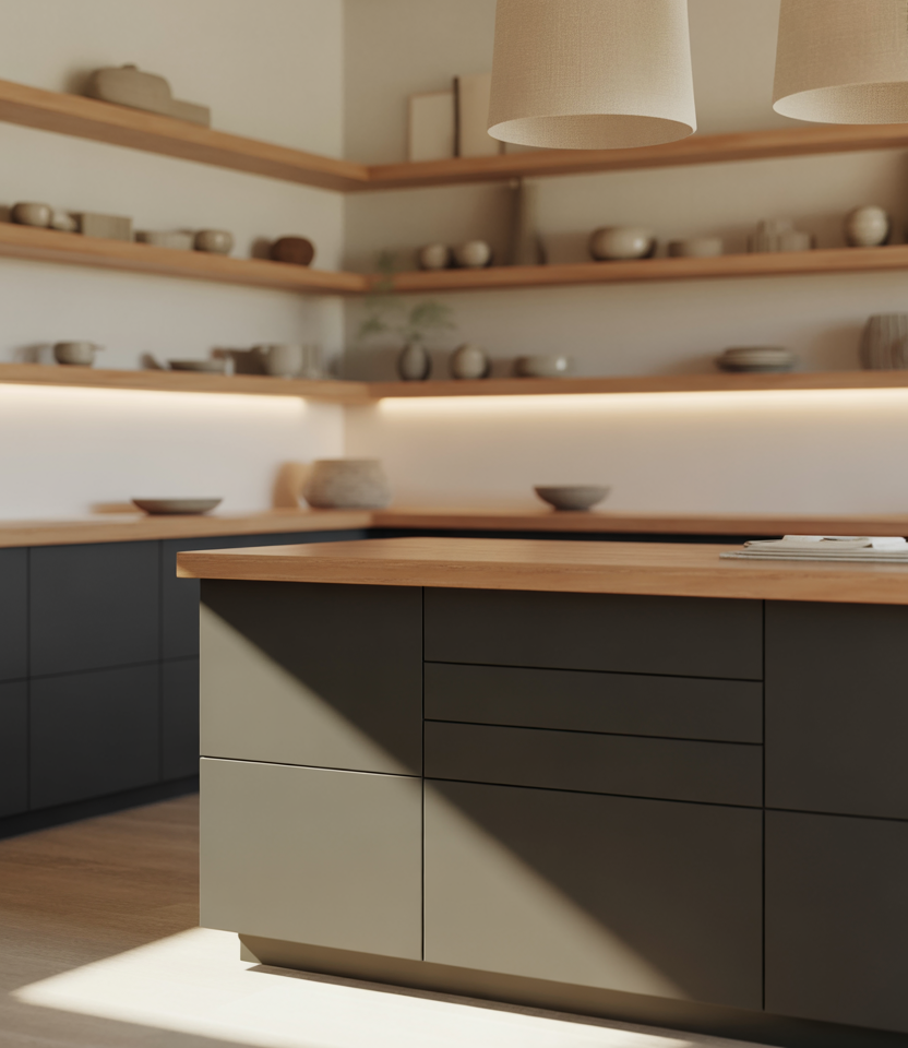 Japandi style is a blend of Scandinavian warmth with Japanese minimalism. Combine black matte cabinetry, wood and open shelving, rice-paper lighting, and honed stone countertops. Decoration must be functional—a few ceramics or a bonsai. This calming, balanced look appeals to homeowners seeking mindfulness in daily tasks.