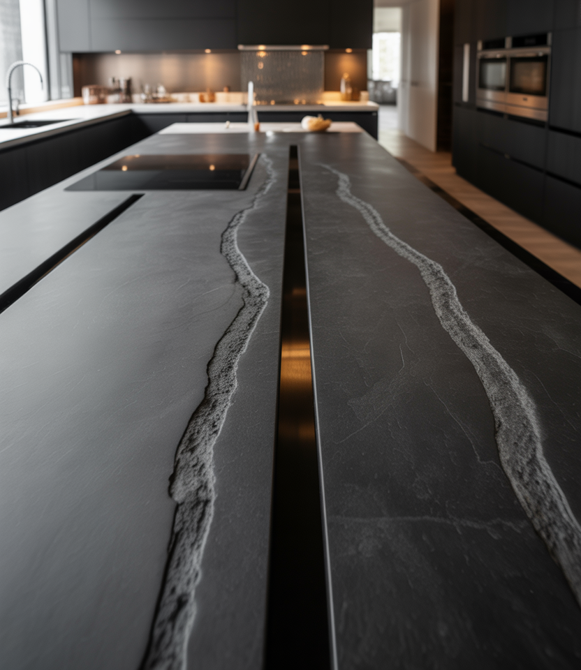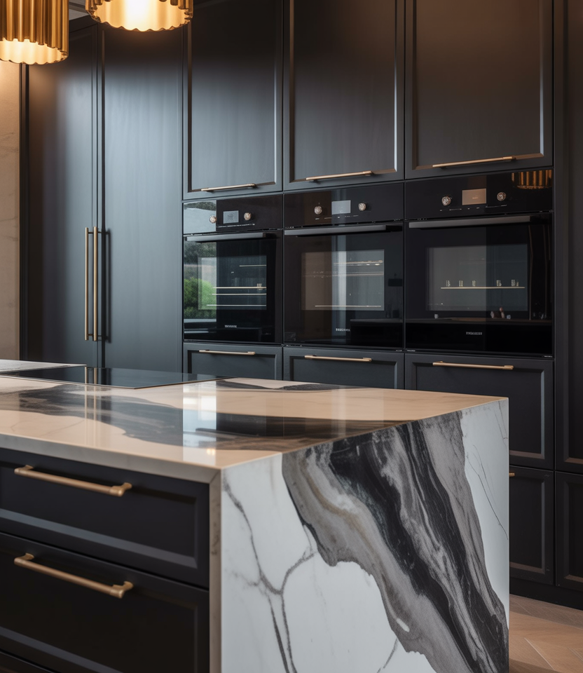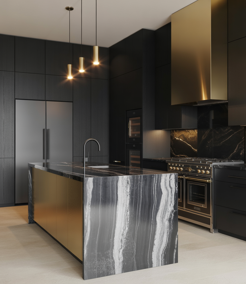 For a luxurious feel, black stone—such as leathered black granite or honed dark quartzite—as a countertop and a waterfall edge island create a dramatic effect. Black countertops are still trendy for 2026, designers say, particularly when combined with lighter accents. Livingetc The stone anchors the space; pair it with soft lighting, subtle metallic hardware, and expressive pendants, and you’ve got a kitchen that reads expensive but is still functional.