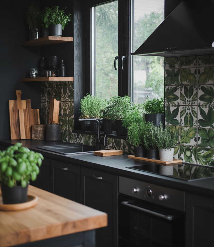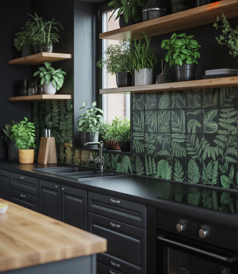 Botanical touches add warmth to black kitchens. Combine dark cabinetry with green and botanical tile, potted herbs, or leafy murals. This inspiration connects cooking and nature, while subtle wood tones keep it grounded. Many designers call it “indoor garden meets urban edge.”