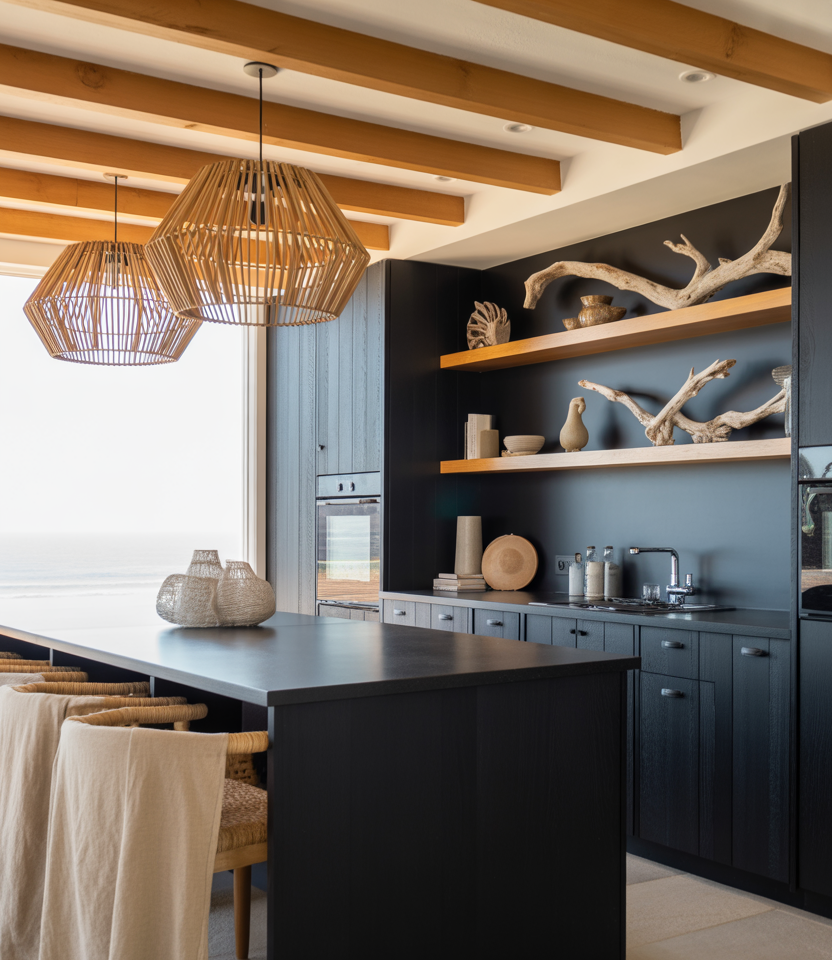 Who says coastal style must be light blue and white? The 2026 trend embraces a moody coastal look—black cabinetry, white and driftwood textures, woven decor, and sandy beige accents. Add a wood countertop or white oak beams to keep it breezy yet grounded. The contrast captures both ease and sophistication.