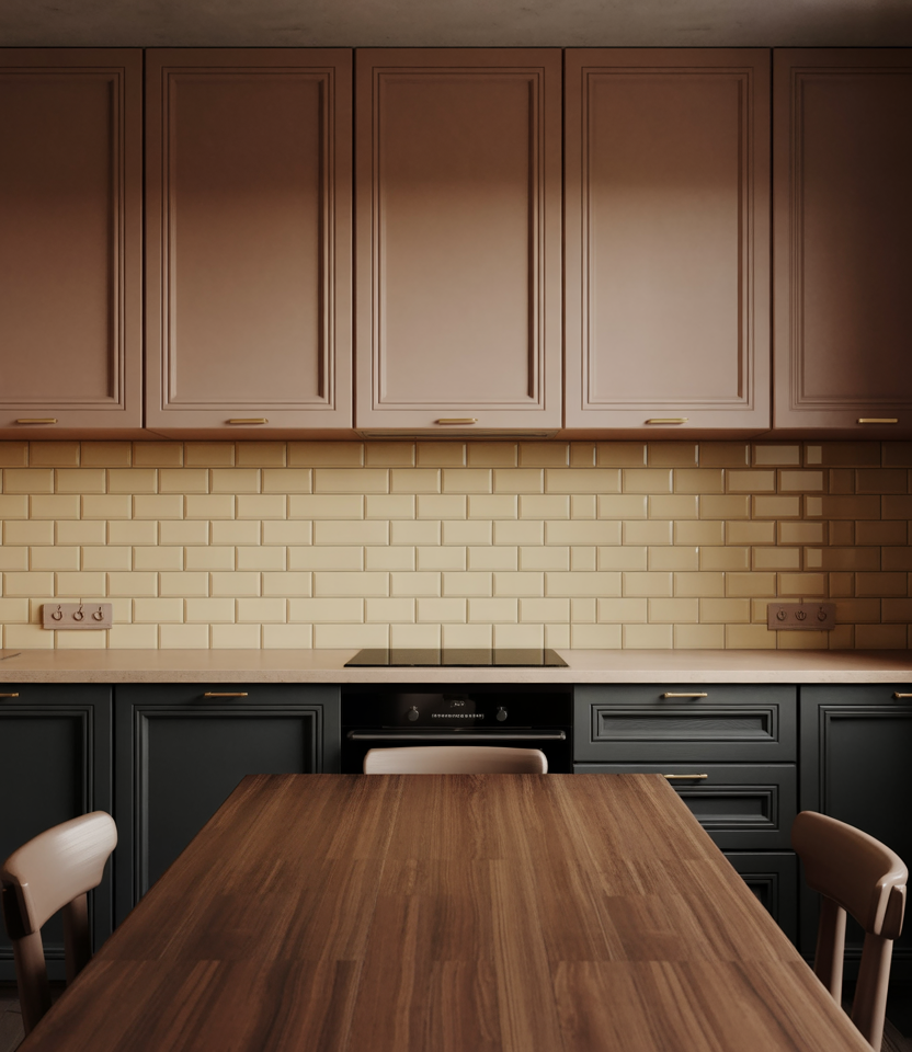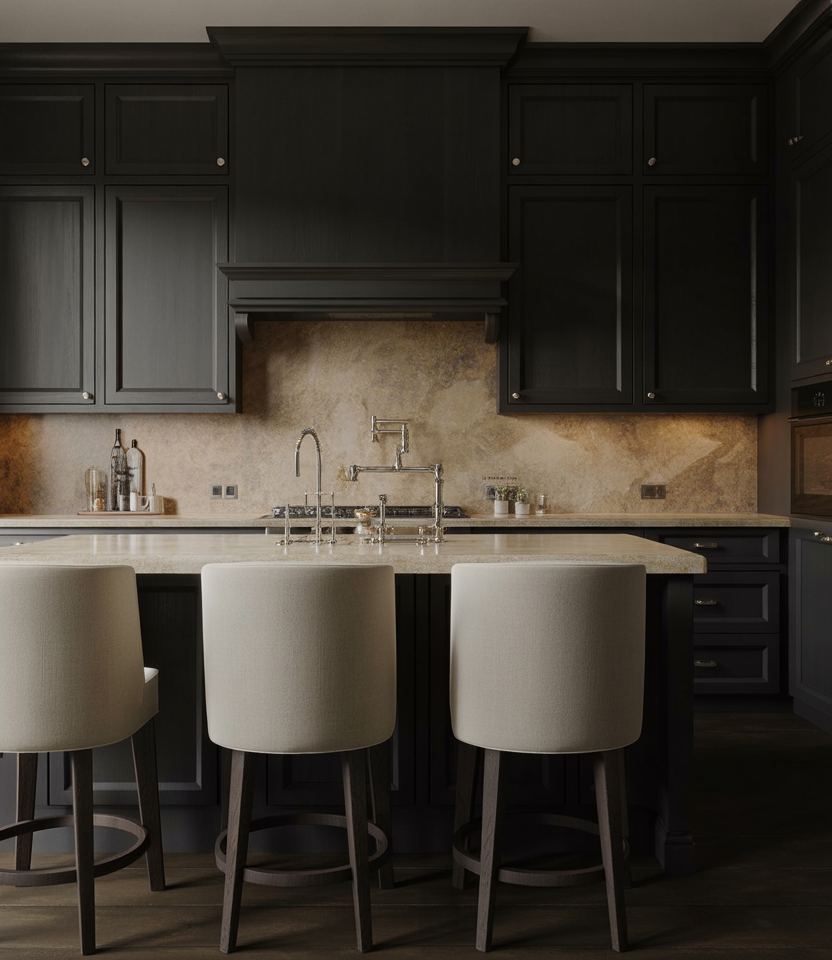 If you prefer a more understated path, use black as the anchor but layer in warm neutrals—taupe, cream, beige, and tones—to soften the space. For example: black lower cabinets, taupe upper cabinets, a cream backsplash, and beige walls. Add a table or bar seating in natural wood for texture. The result is an elegant, cocooning kitchen that will still feel fresh in 2026.