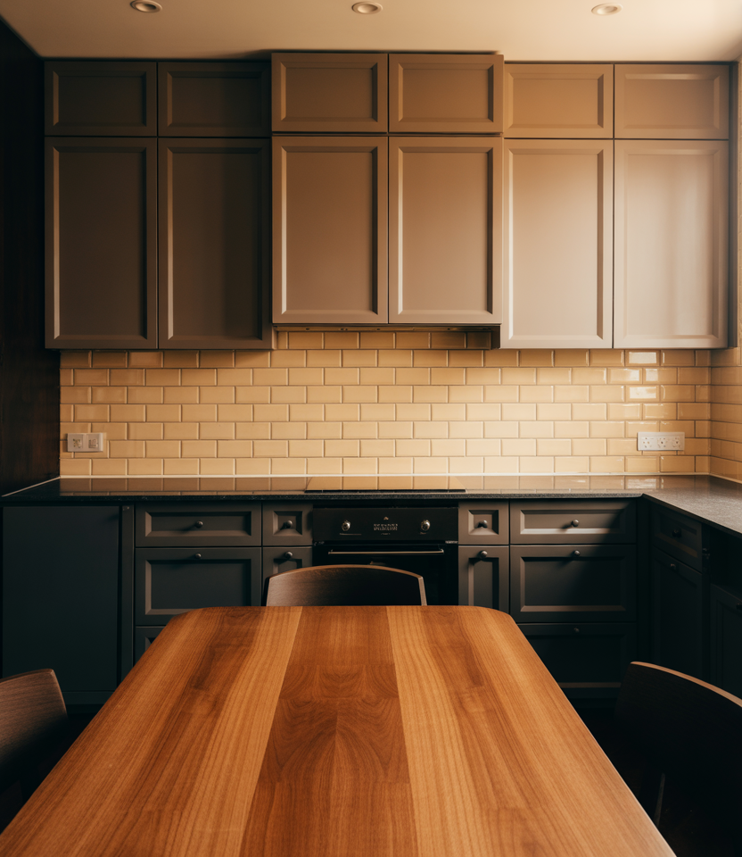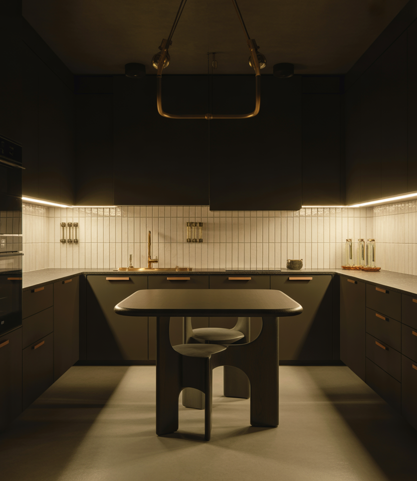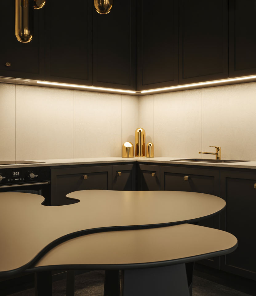 A matte black and cream palette, when done right, is sophisticated and theatrical. Picture matte black cabinetry illuminated by hidden LED strips beneath cream shelves. Lighting creates depth and silhouette. A sculptural table or brass accents finish the space, elevating daily cooking to a miniature stage performance.