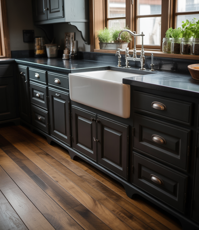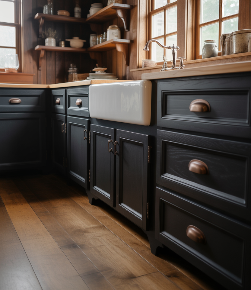 Modern farmhouse kitchens are evolving into darker, richer spaces. Combine black shaker cabinets with wood and white oak flooring, an apron-front sink, and vintage-style hardware. Soft linen curtains and rustic decor tie it together. This design represents country comfort reimagined with a sophisticated touch for 2026.