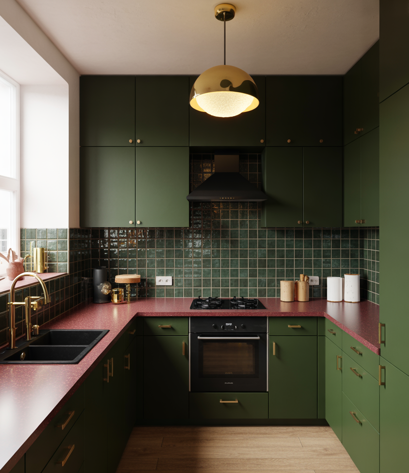 For those with artistic personalities, combine bold pink, emerald green, and black to create striking juxtapositions. Matte black cabinetry, pink terrazzo countertops, and dark green tile merge into an expressive aesthetic. Sculptural hardware and gold appliances turn the kitchen into a gallery space filled with inspiration that just so happens to be functional.