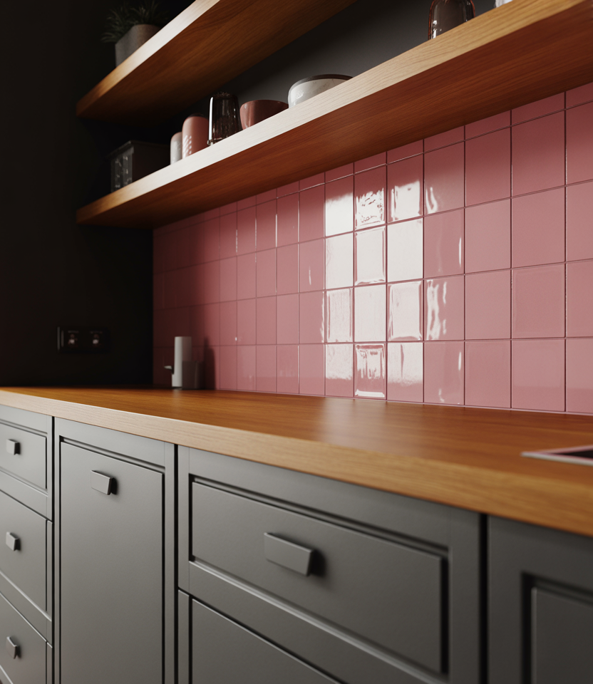 For an unexpected twist, introduce touches of pink and black mixed in the kitchen. For instance: black matte cabinets, a pink glass backsplash or pink pendant light, and a wood countertop or white oak shelf to offset the color intensity. This whimsical mix adds personality and breaks the “all-black” gloom into something airy and playful.