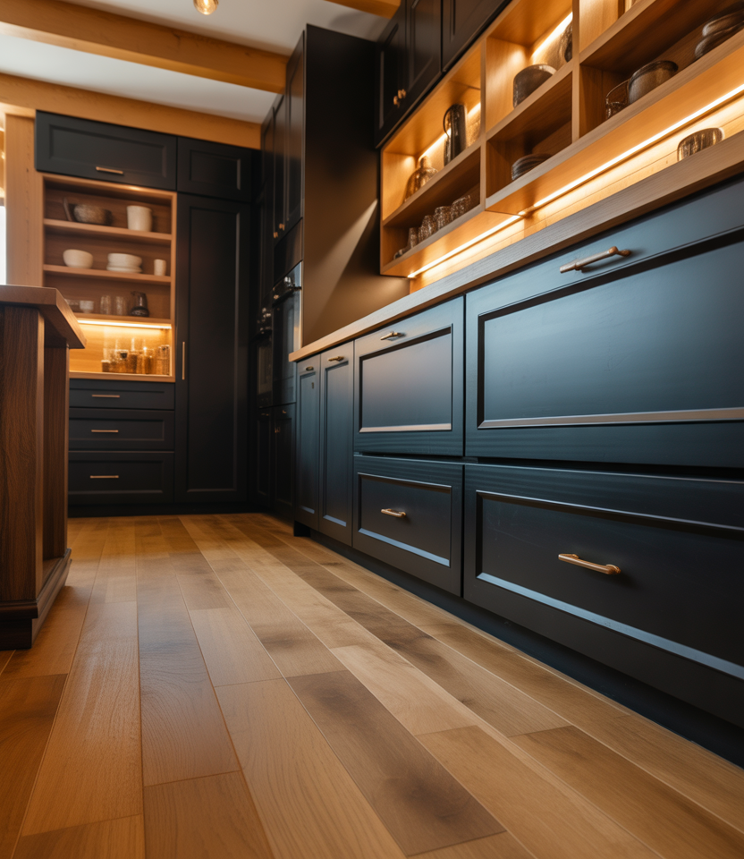 9. Black Kitchen with White Oak Flooring and Wood Accents