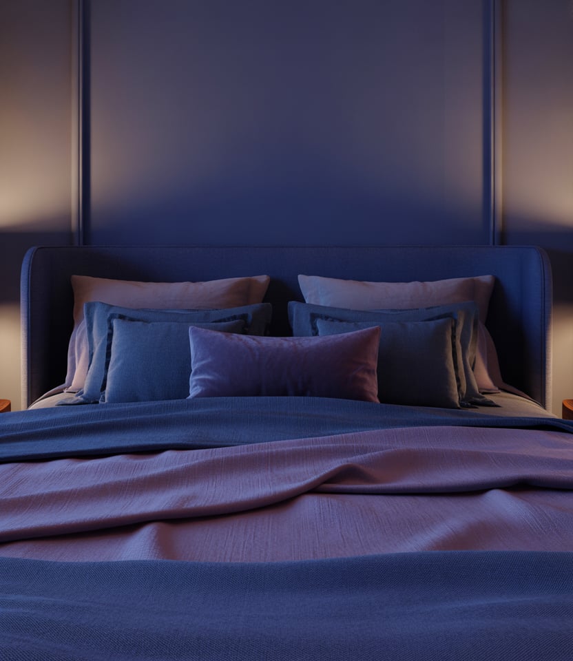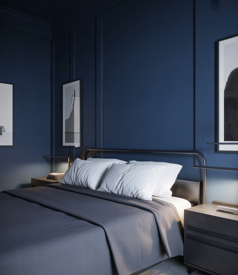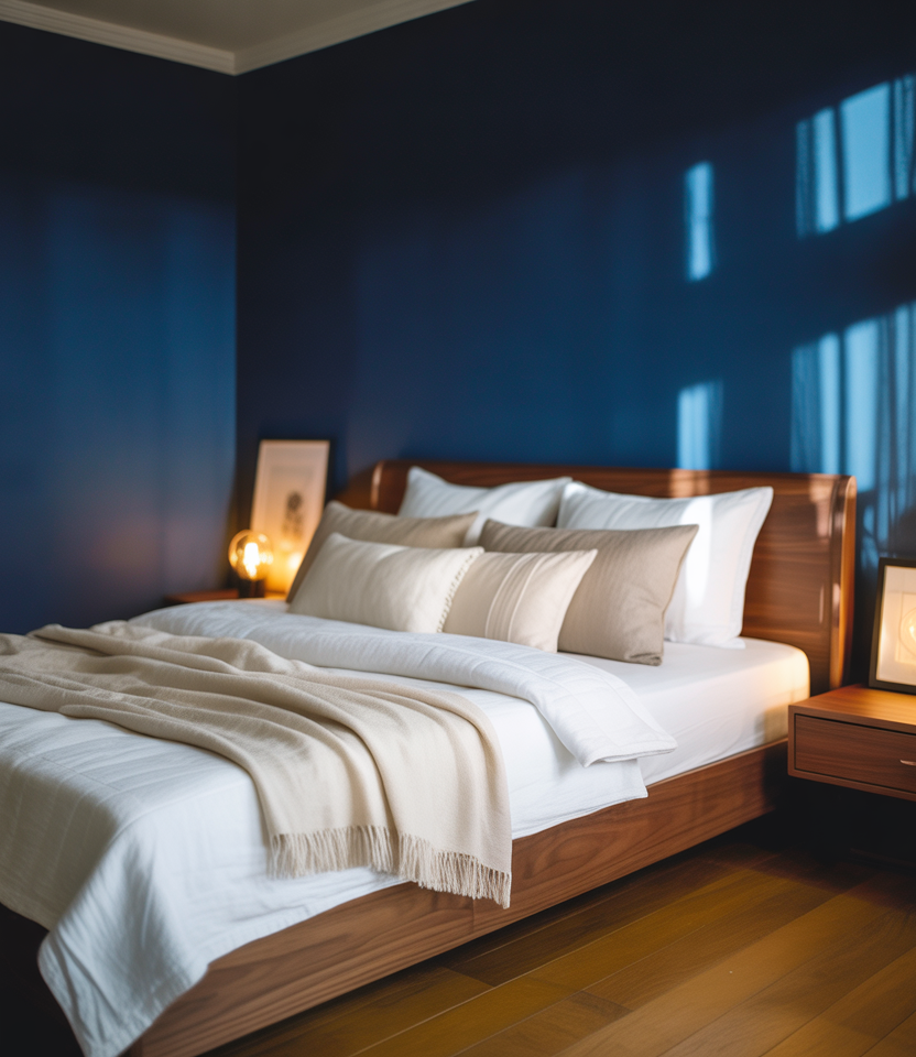 Dark blue walls layered with purple undertones create a moody yet elegant bedroom that feels intentionally styled. This palette leans dramatic without becoming theatrical, especially when fabrics stay matte and textures remain soft. It’s a look that works well in bedrooms meant for winding down rather than multitasking.