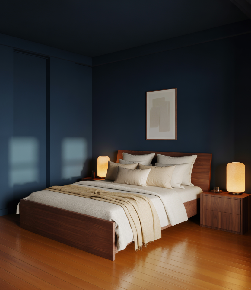 Midnight blue walls create a cocoon-like feeling that feels especially right for adults craving rest and privacy. Paired with warm woods and soft textiles, this approach balances midnight tones with subtle browns and accents that prevent the room from feeling heavy. It works beautifully in primary bedrooms where lighting can be layered, letting the blue shift from deep and dramatic at night to rich and inviting during the day.