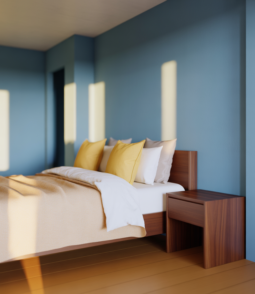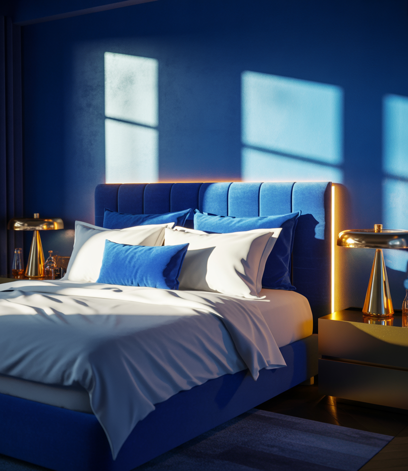 Paired with royal shades and white, royal blue instantly enhances a bedroom. Crisp bedding with subtle metallic details keeps the ambience polished rather than heavy. It is a confident choice for the ones looking for impact.