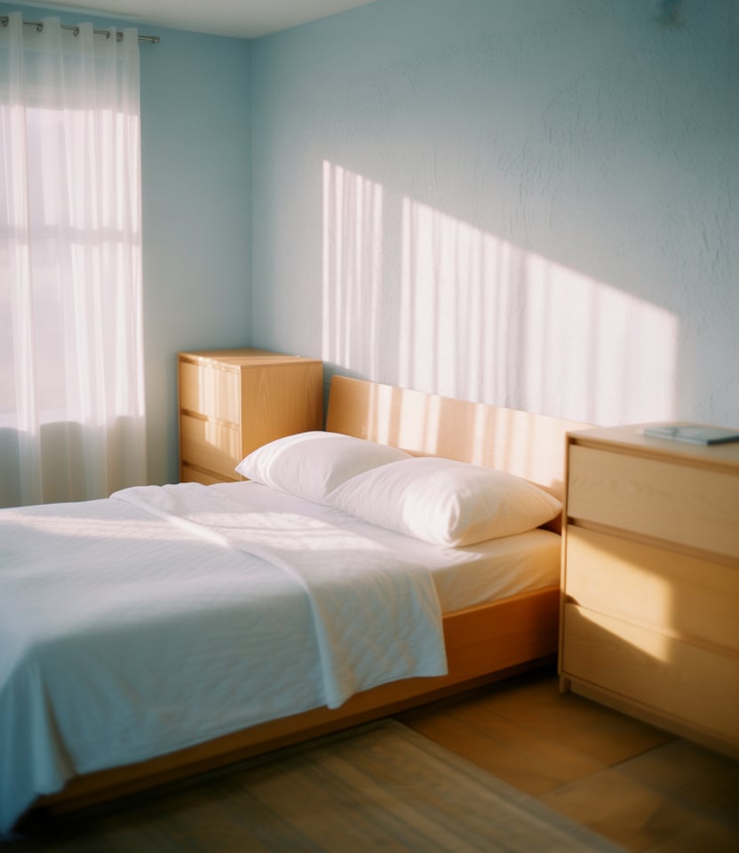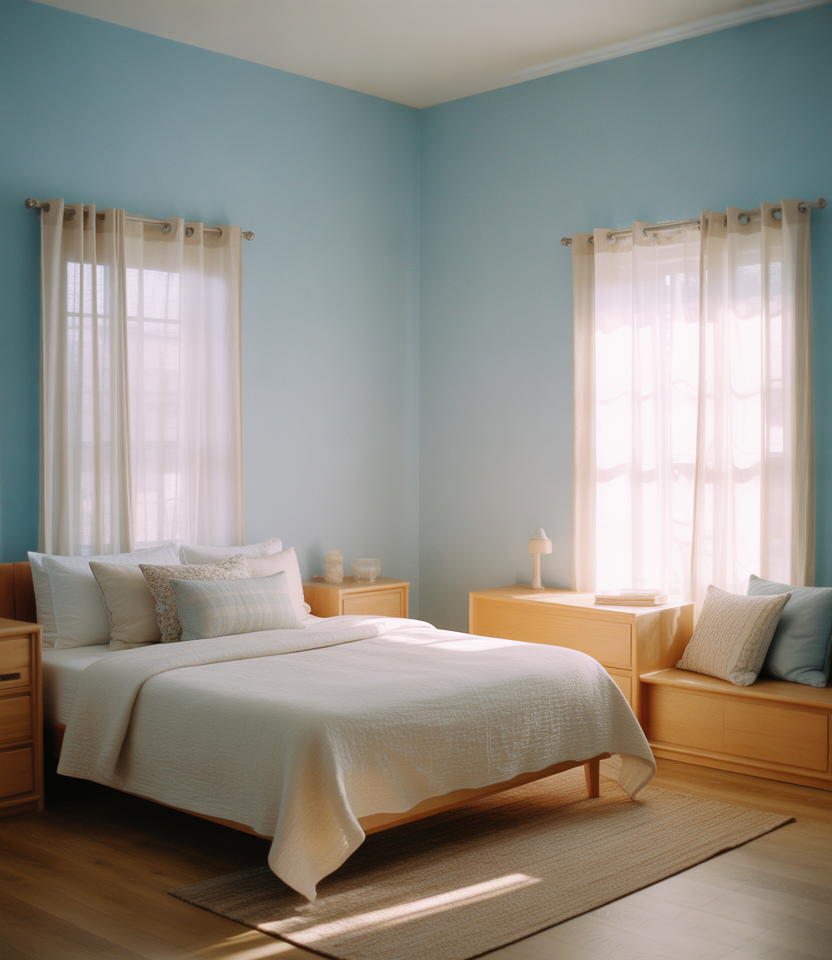 Light blue walls paired with light tones and subtle brown accents create a bedroom that feels relaxed and approachable. This combination balances freshness with warmth, making the space feel welcoming rather than stark. Woven textures, warm wood nightstands, and layered bedding help the blue feel grounded and lived-in.
