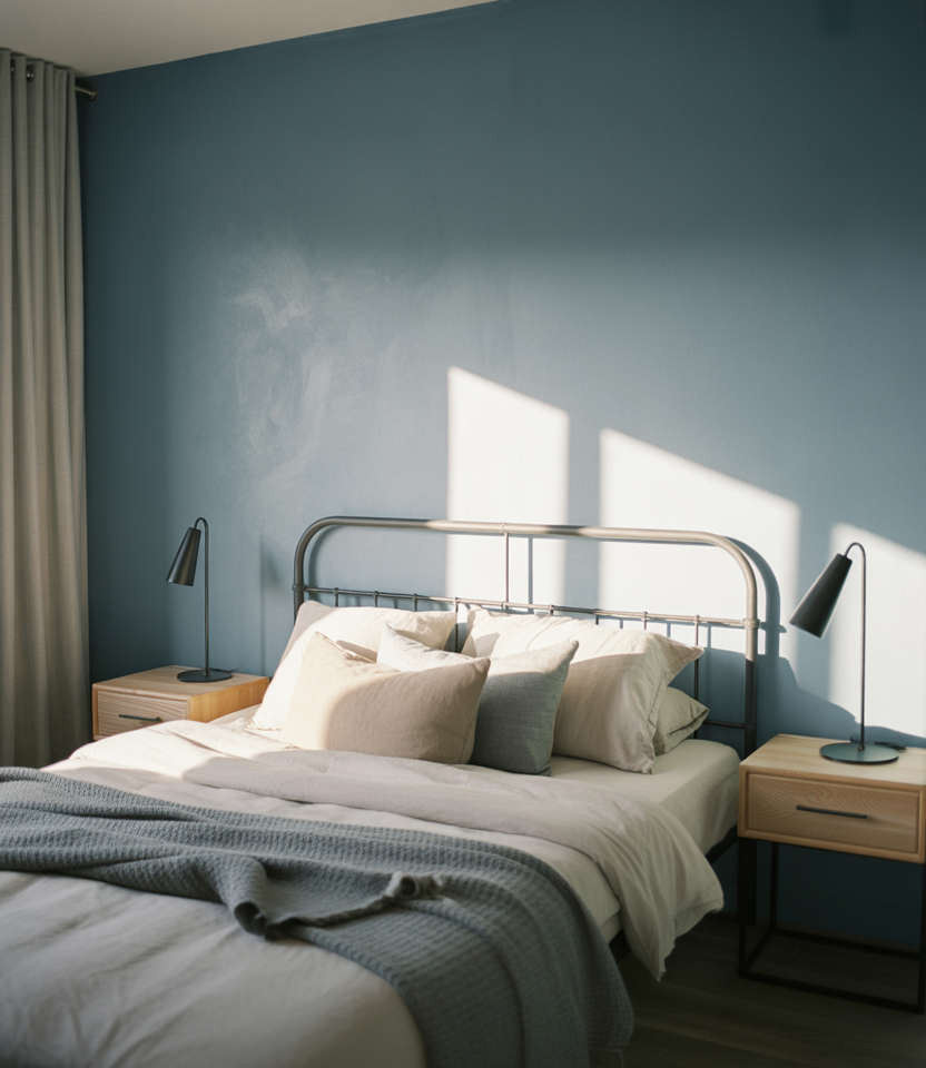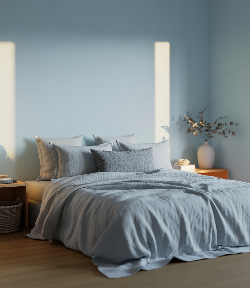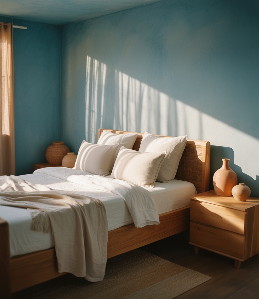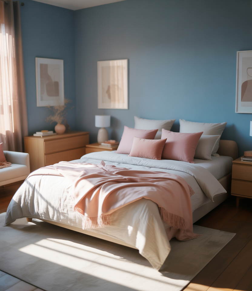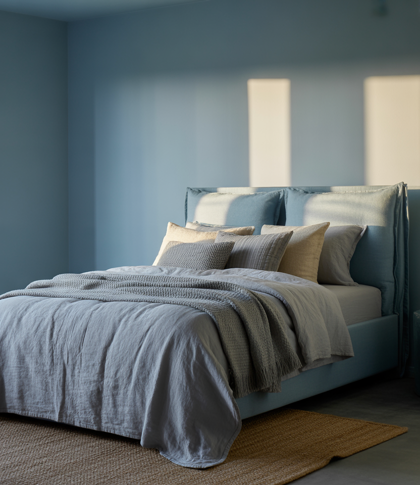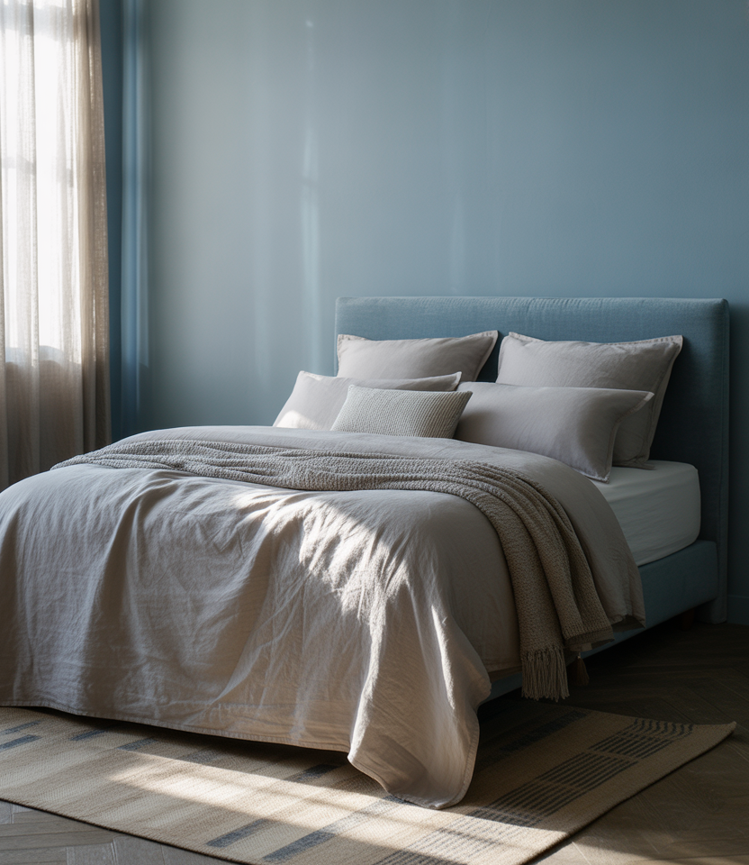 Dusty blue offers a muted, lived-in alternative to brighter shades, especially when layered with dusty tones and gray and textiles. This combination feels grown-up and subtle, making it ideal for people who want color without visual noise. Upholstered beds, woven throws, and matte finishes enhance the softness of the palette.