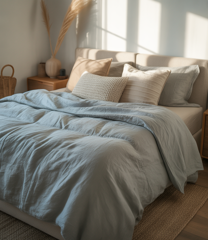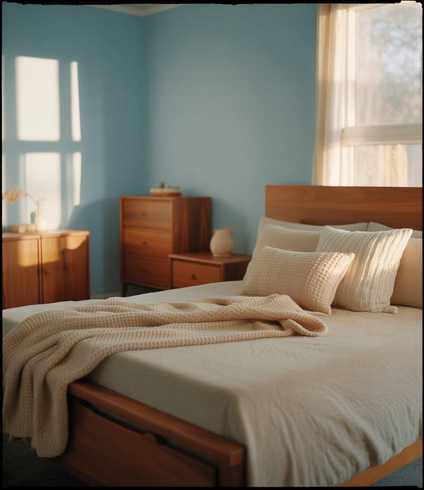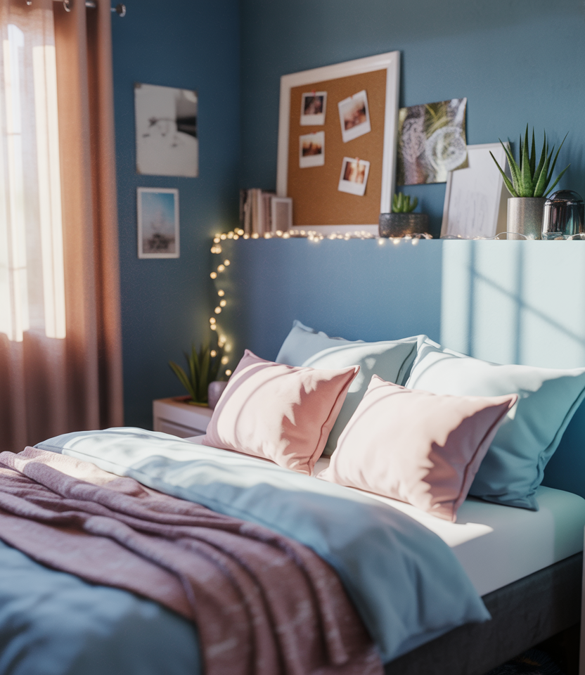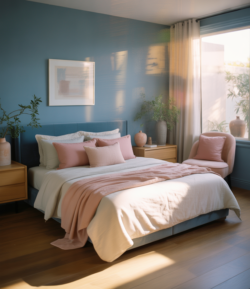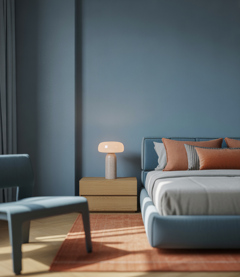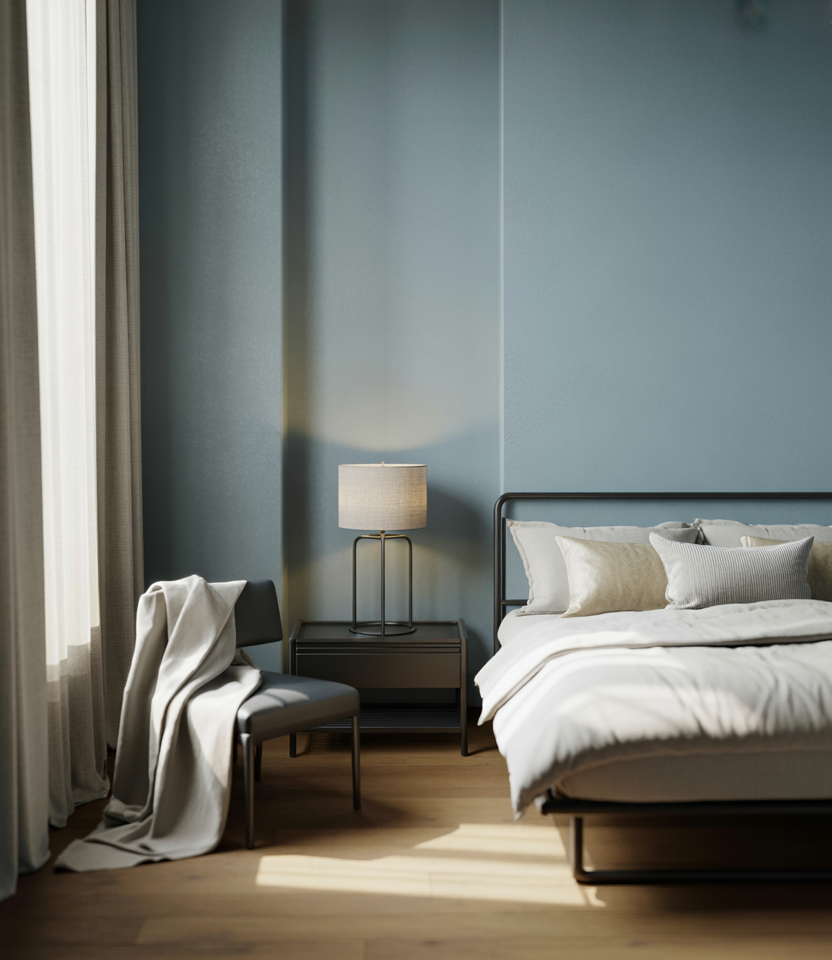 Dusty blue offers a muted, lived-in alternative to brighter shades, especially when layered with dusty tones and gray and textiles. This combination feels grown-up and subtle, making it ideal for people who want color without visual noise. Upholstered beds, woven throws, and matte finishes enhance the softness of the palette.