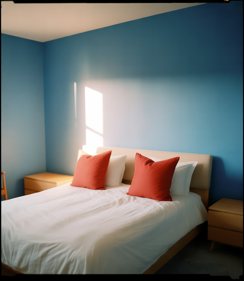 Using small accents in red and blue, the blue can become surprisingly dynamic. The trick is keeping it minimal, using a soft throw, a piece of matching artwork, and a one-toned, unstructured cushion.This combination feels curated rather than bold.