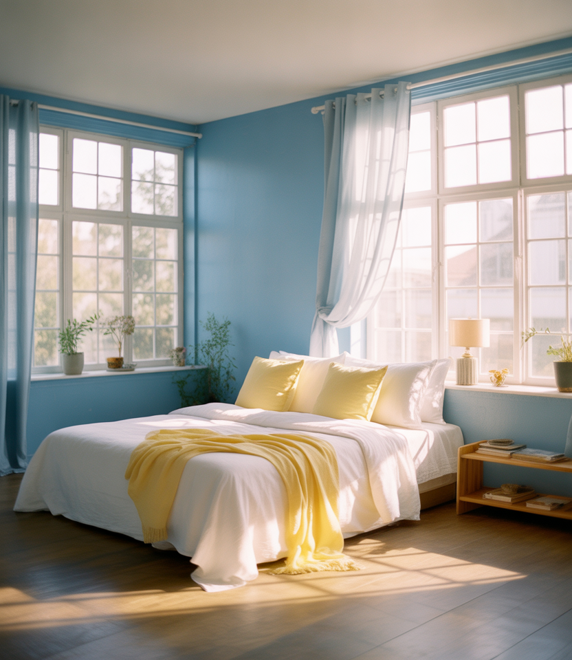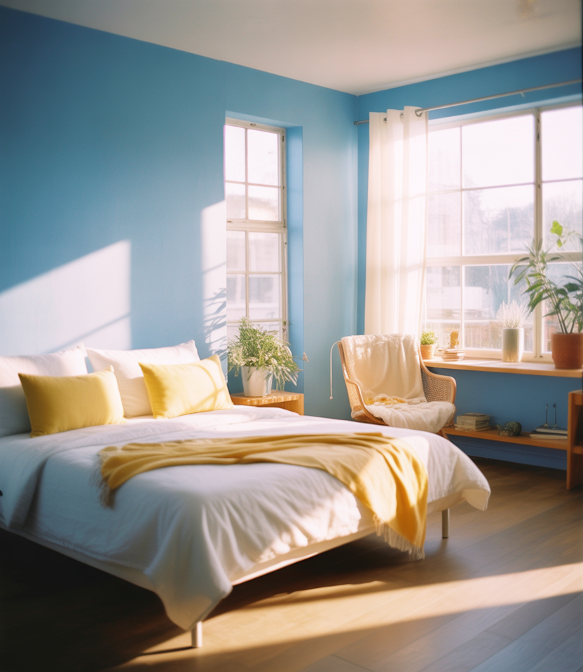 Walls painted in sky blue, complemented by yellow accents, are optimistic and refreshing. It is especially effective in bedrooms where sunlight comes in early, as it makes the space feel warmer and enhances the light in the room.