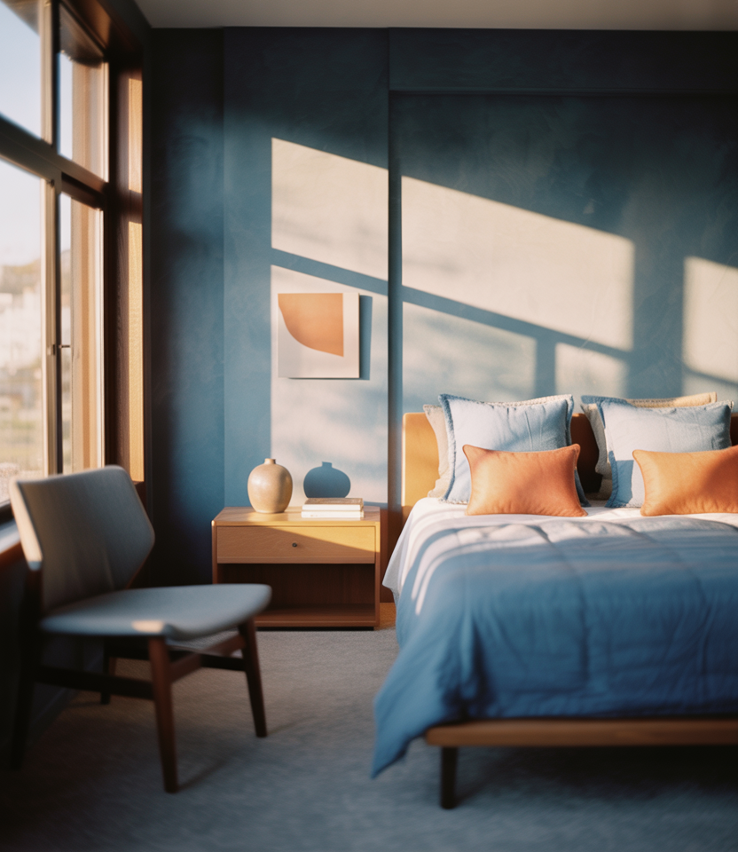 A careful combination of blue with orange accents achieves a modern, creative look. Burnt or muted tones of orange work best, adding warmth without a clash. This combination is youthful, yet intentional.