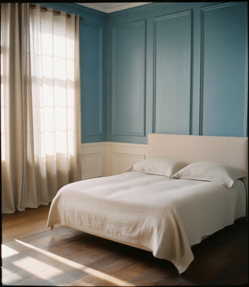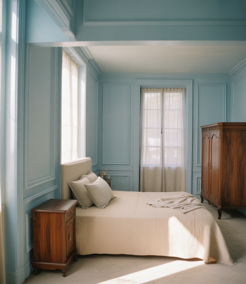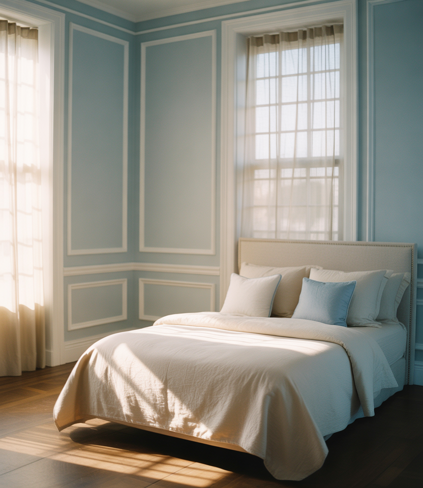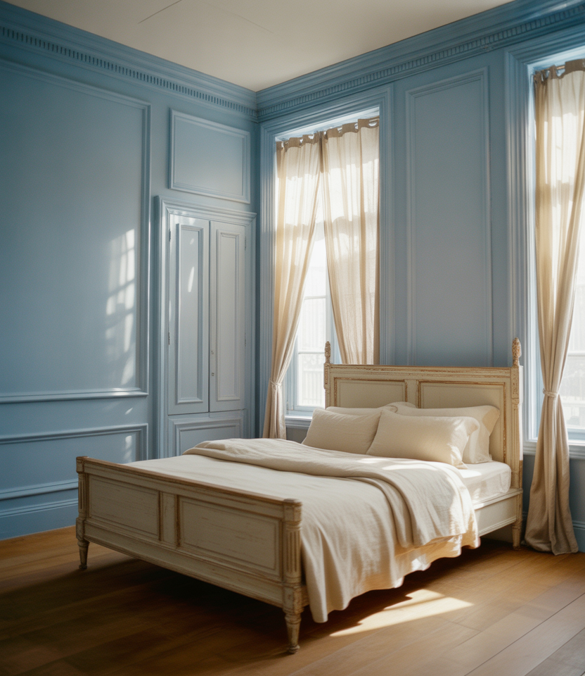Pale blue walls paired with classic detailing feel effortlessly elegant. When blended with pale shades and subtle French influences, the result is romantic without feeling themed. Think soft molding, antique-style nightstands, and relaxed linen bedding.
