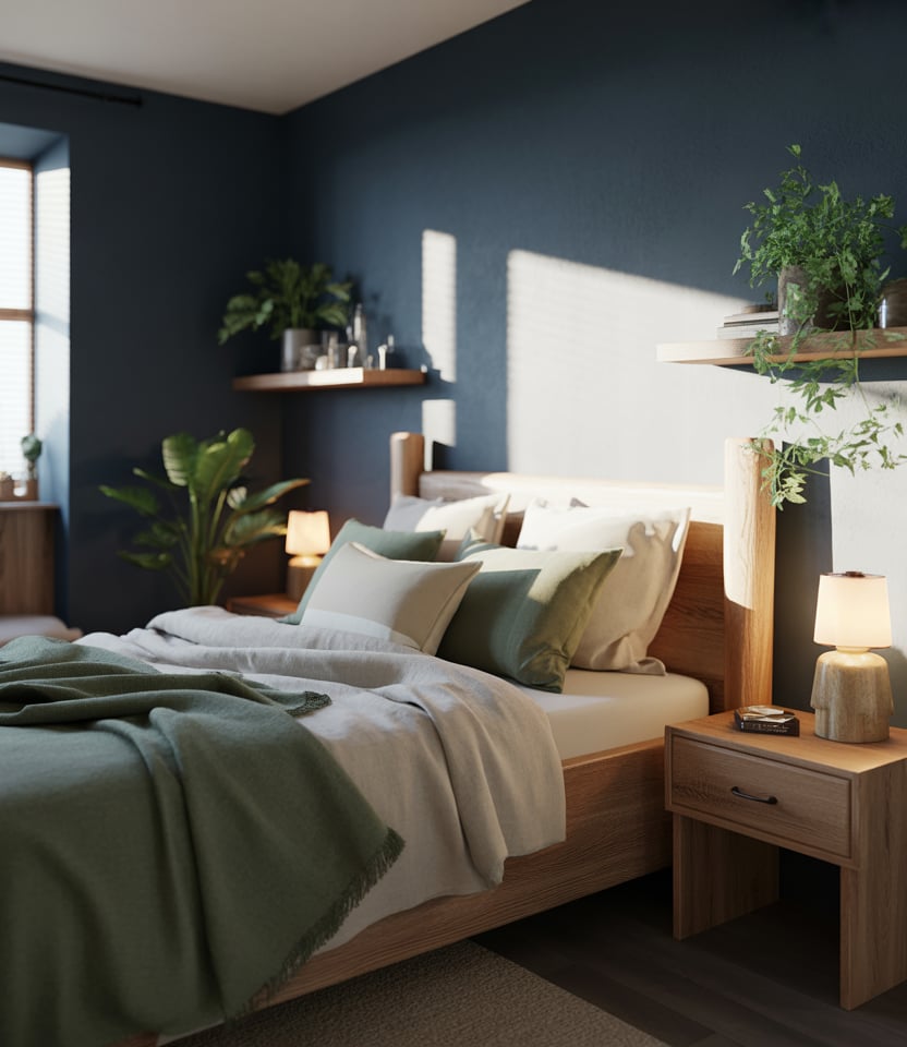 Dark blue walls paired with dark tones and subtle green elements feel grounded and restorative. Natural wood finishes help balance the depth, creating a space that feels connected to nature.