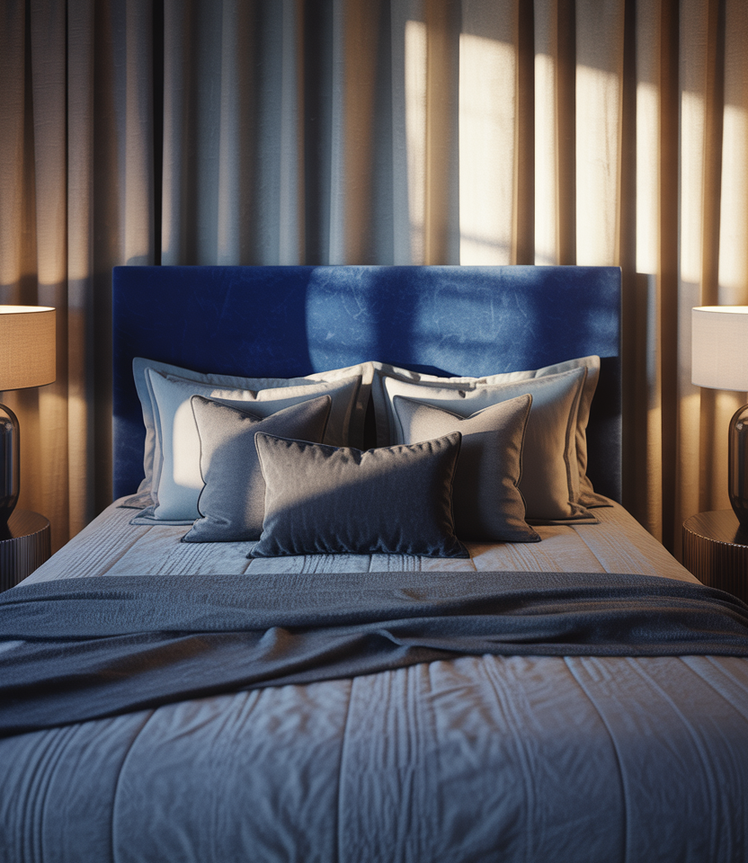 For a bolder look, deep blue paired with black and accents creates a striking, modern bedroom that still feels intentional. This aesthetic approach relies on clean lines, limited decor, and strong contrast rather than excessive pattern. It’s especially popular in urban condos and modern townhomes.