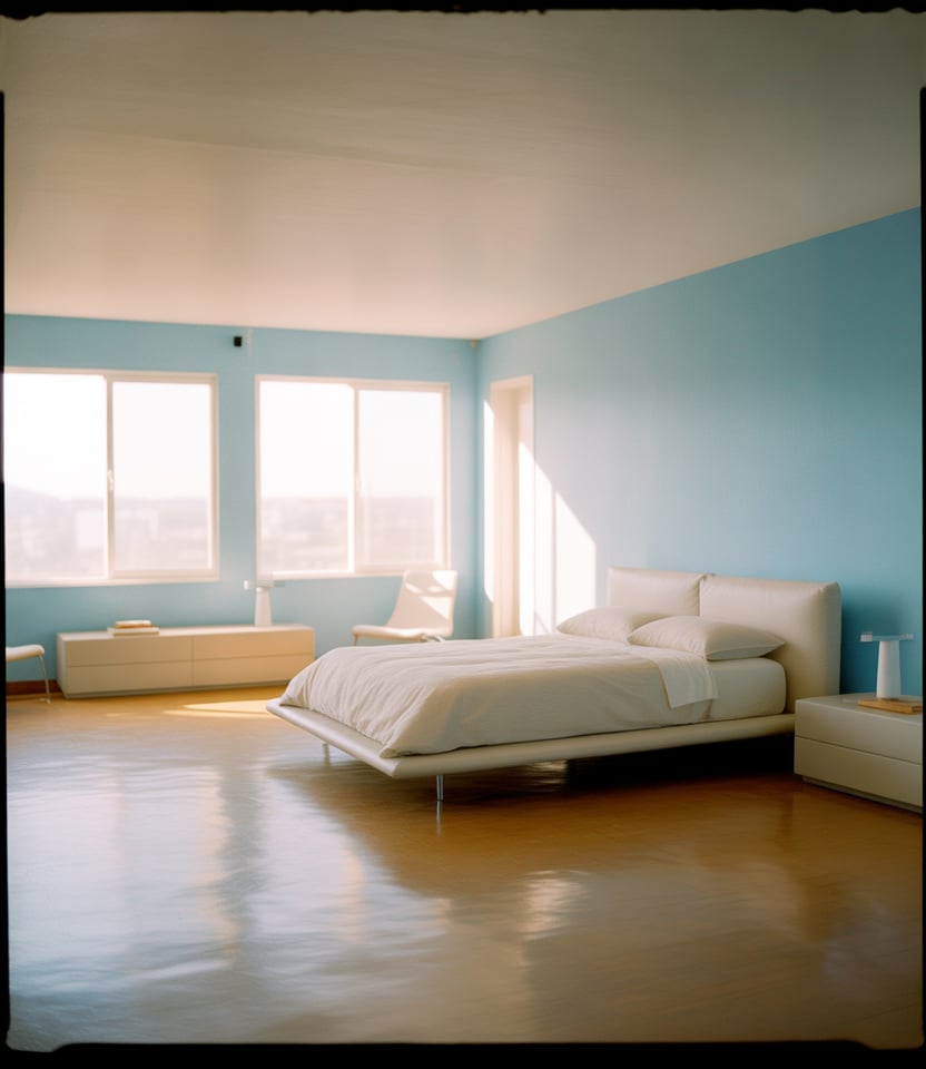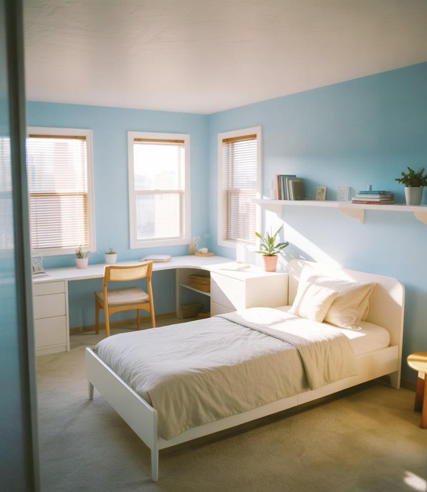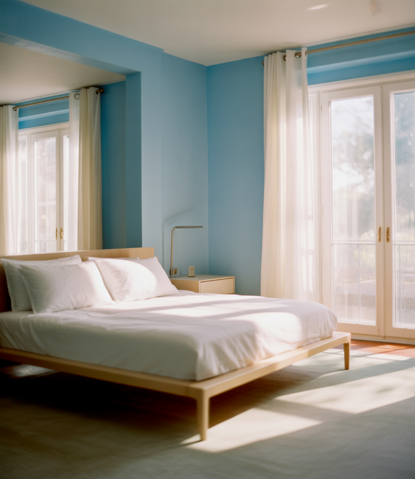 Sky blue walls combined with sky shades and crisp white finishes create a bedroom that feels open and uncluttered. Minimal decor allows the color to breathe, making the space feel larger and more serene without looking unfinished.