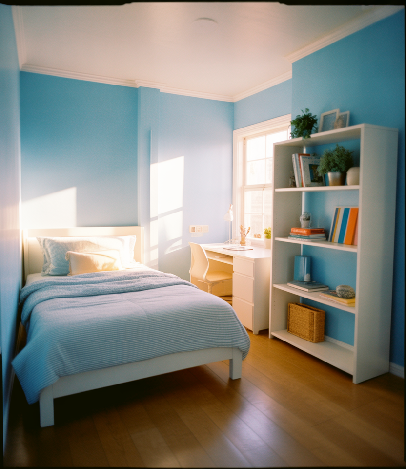 Optimistic and open sky blue walls are great for teens. With the sky tones and adaptable furniture, the room matures with its occupant. The color fosters creativity without being childish.