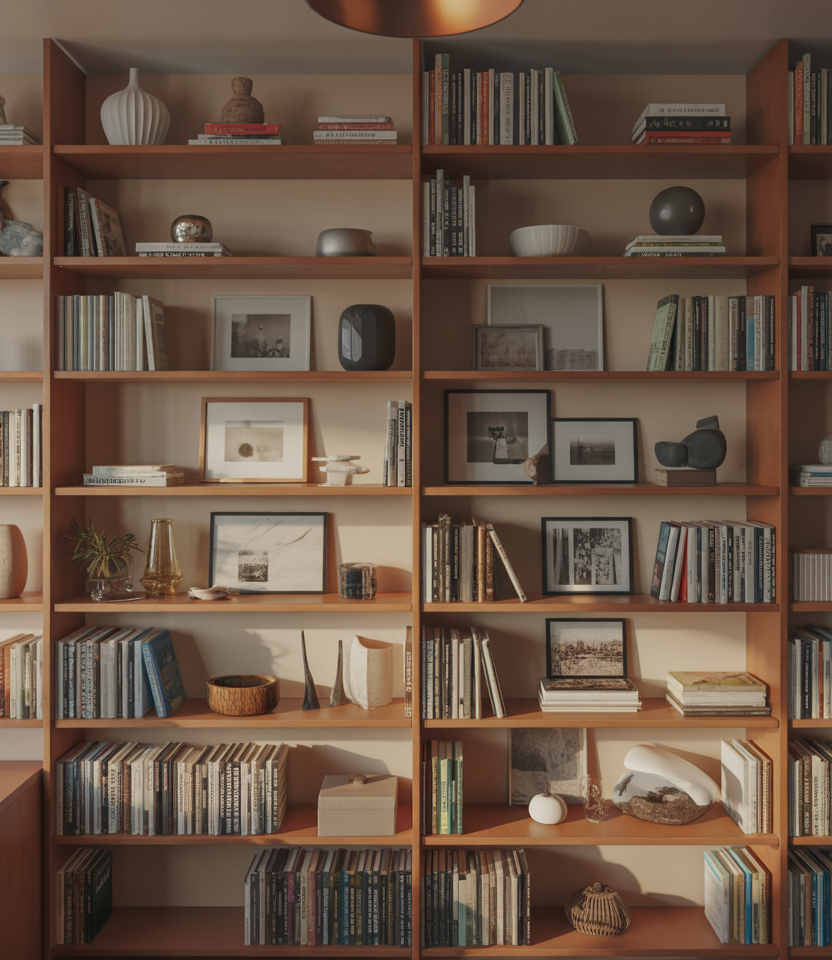 Maximalist bookshelf styling in 2026 leans heavily into storytelling. Family photos, travel objects, and well-loved books coexist in layered arrangements that feel lived in. The goal isn’t perfection, but authenticity that reads visually rich.
