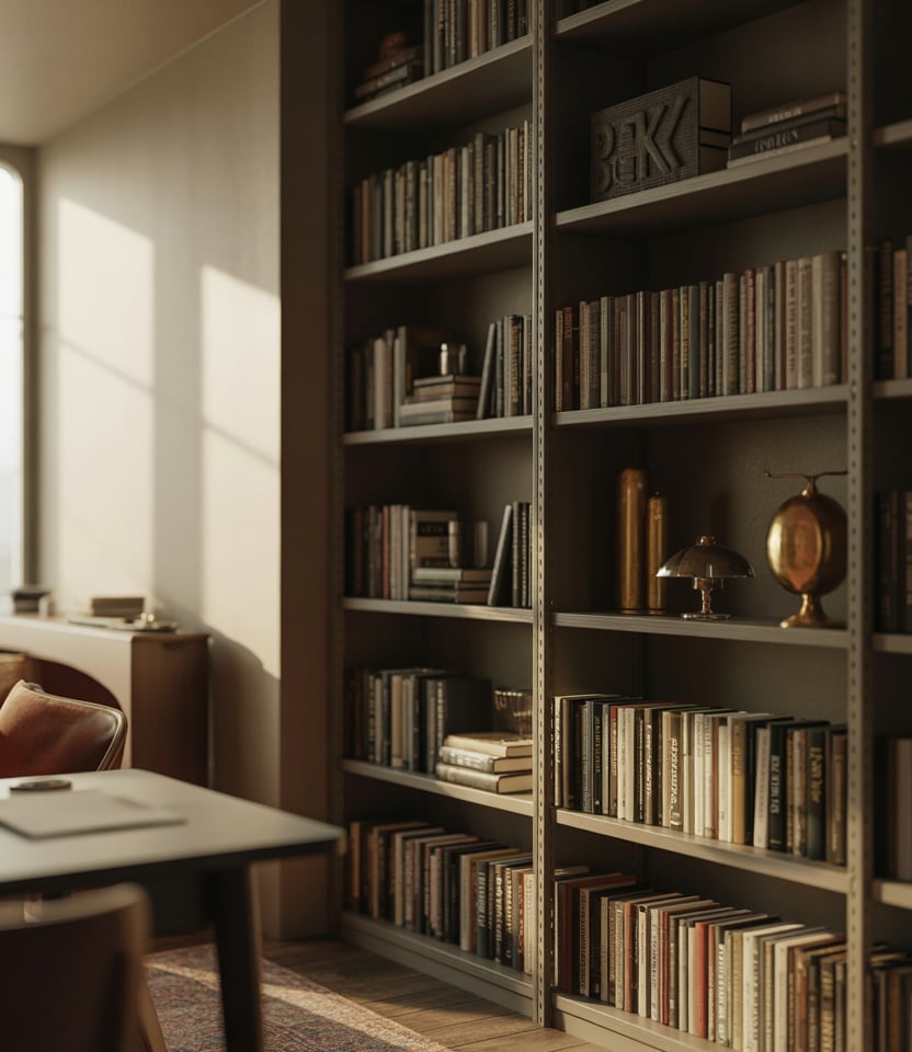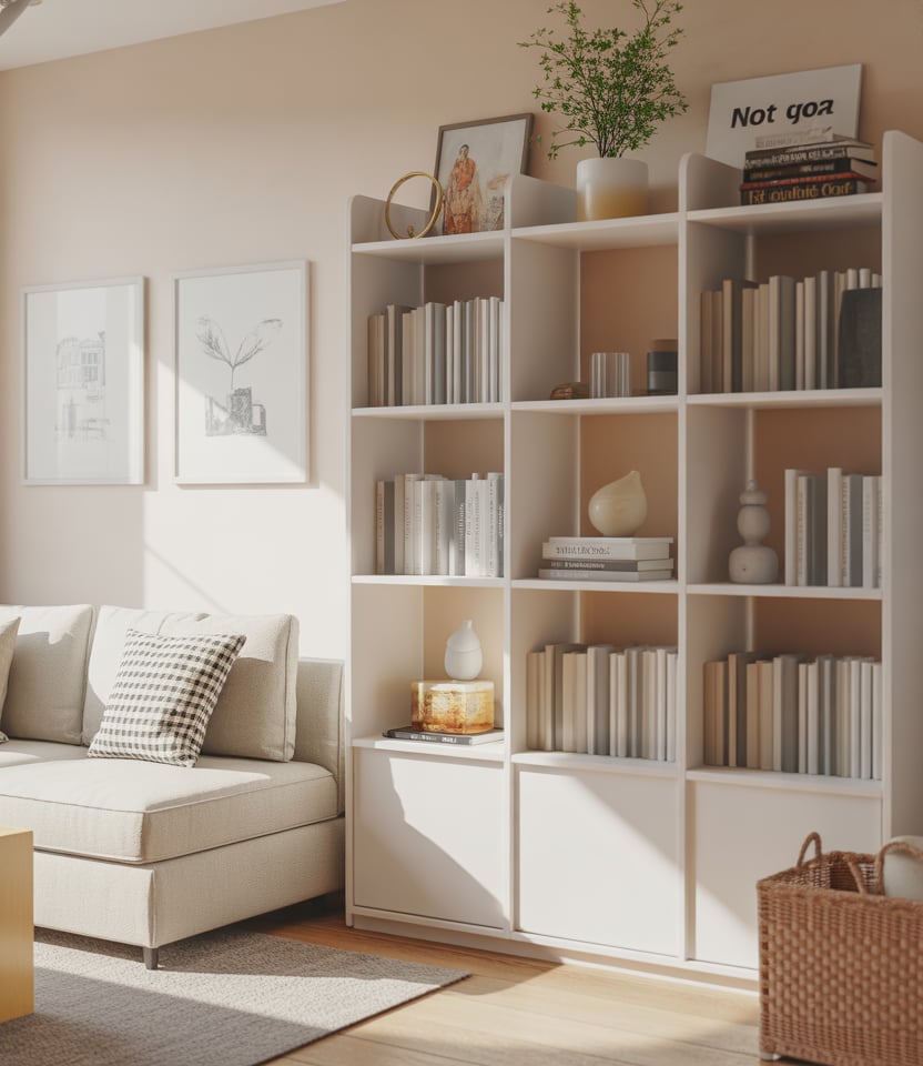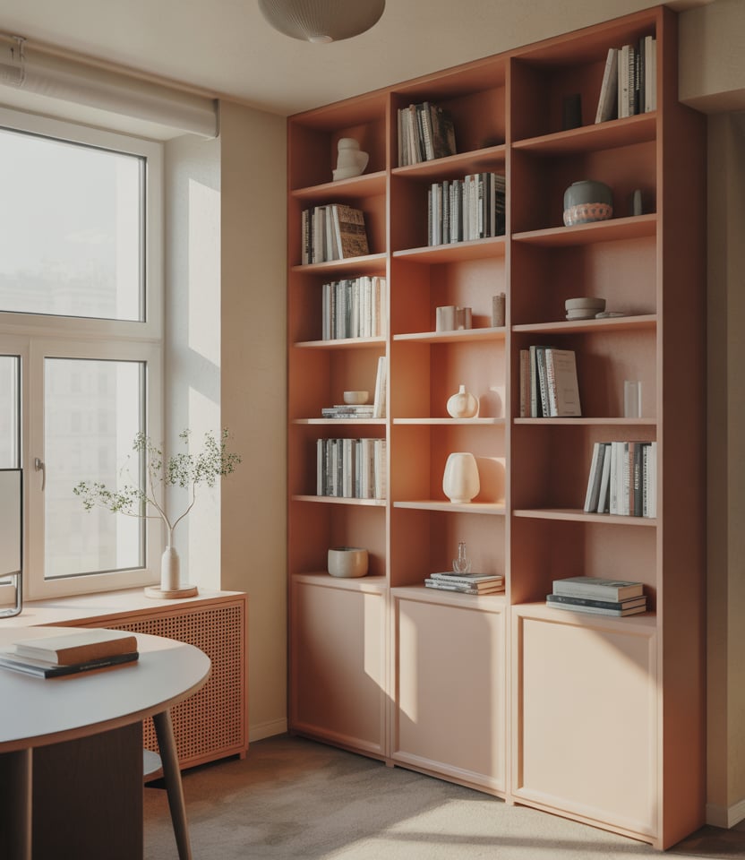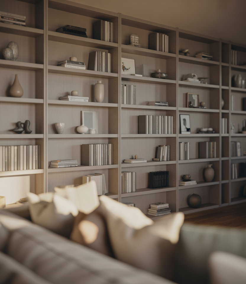 Neutral bookshelf styling in 2026 is about restraint without feeling empty. Soft beiges, warm whites, and pale woods create shelves that quietly support a room rather than dominate it. When paired with thoughtfully arranged books, the effect feels grounded and serene, especially in bedrooms or shared living spaces.