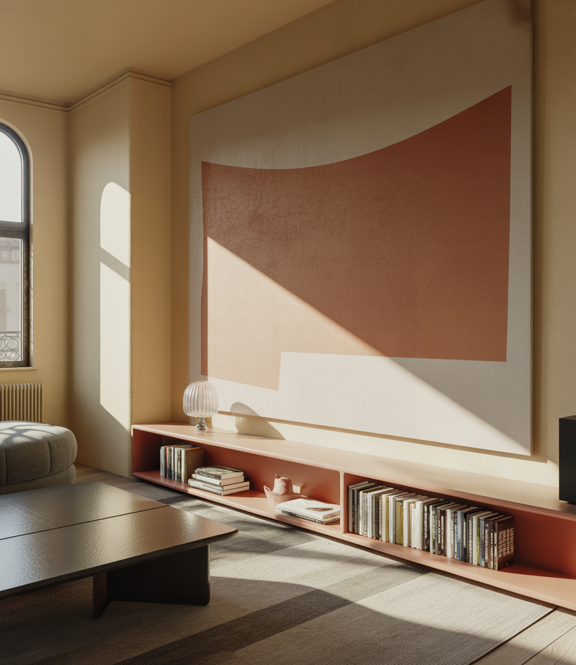 Long and low shelving units are becoming favorites for grounding large walls in 2026. Often placed beneath oversized art or photography, they balance vertical visuals with horizontal weight. Styled simply, they let artwork shine while still offering functional storage.