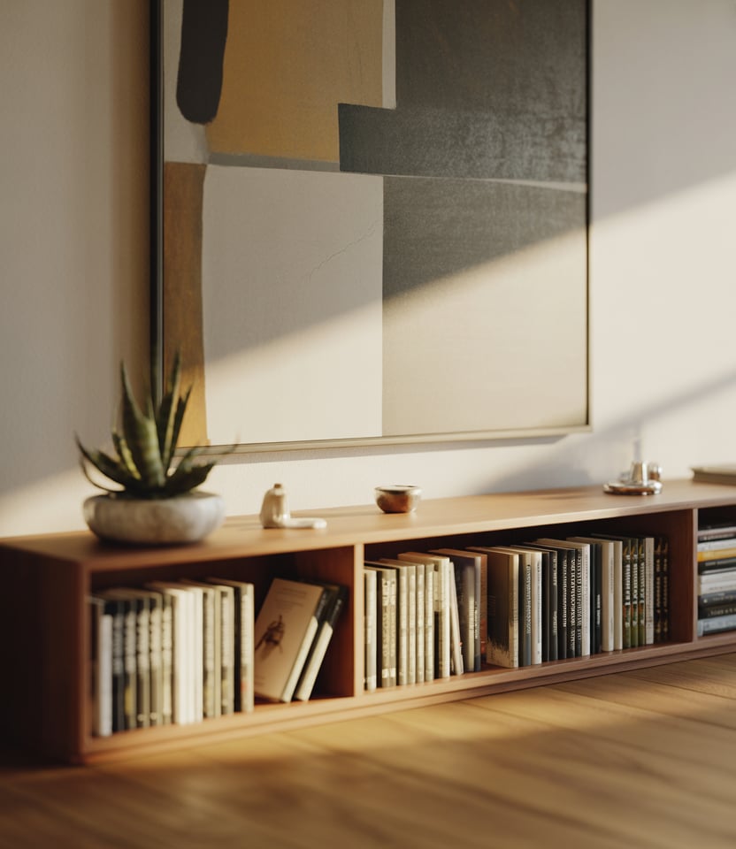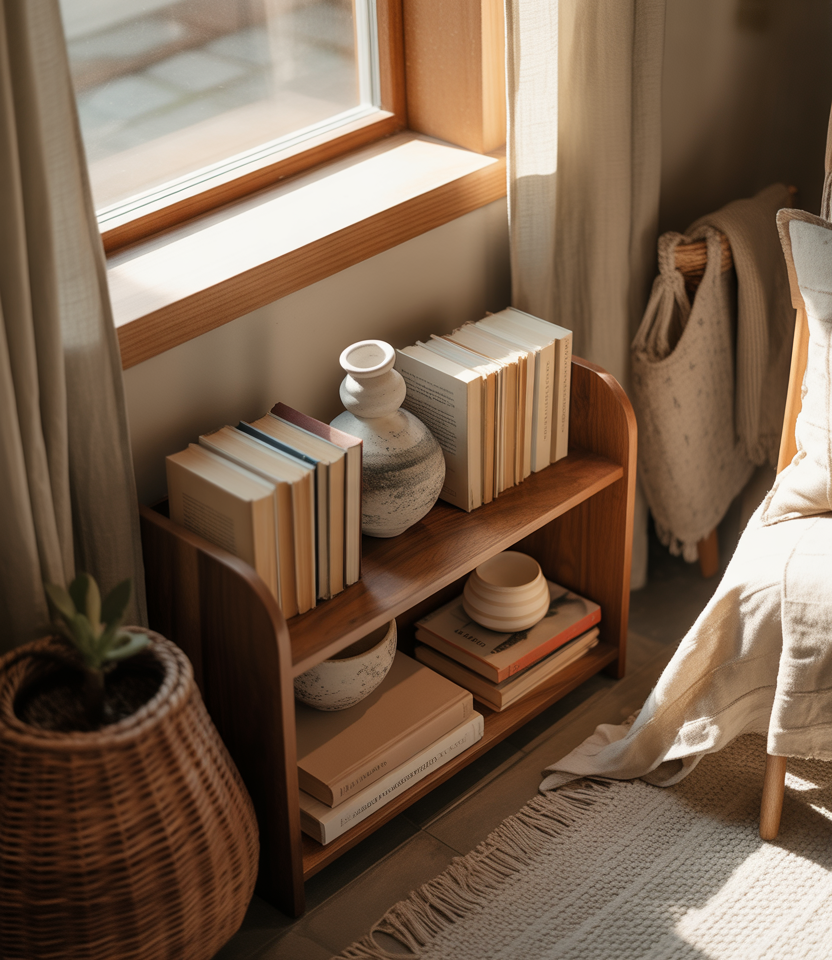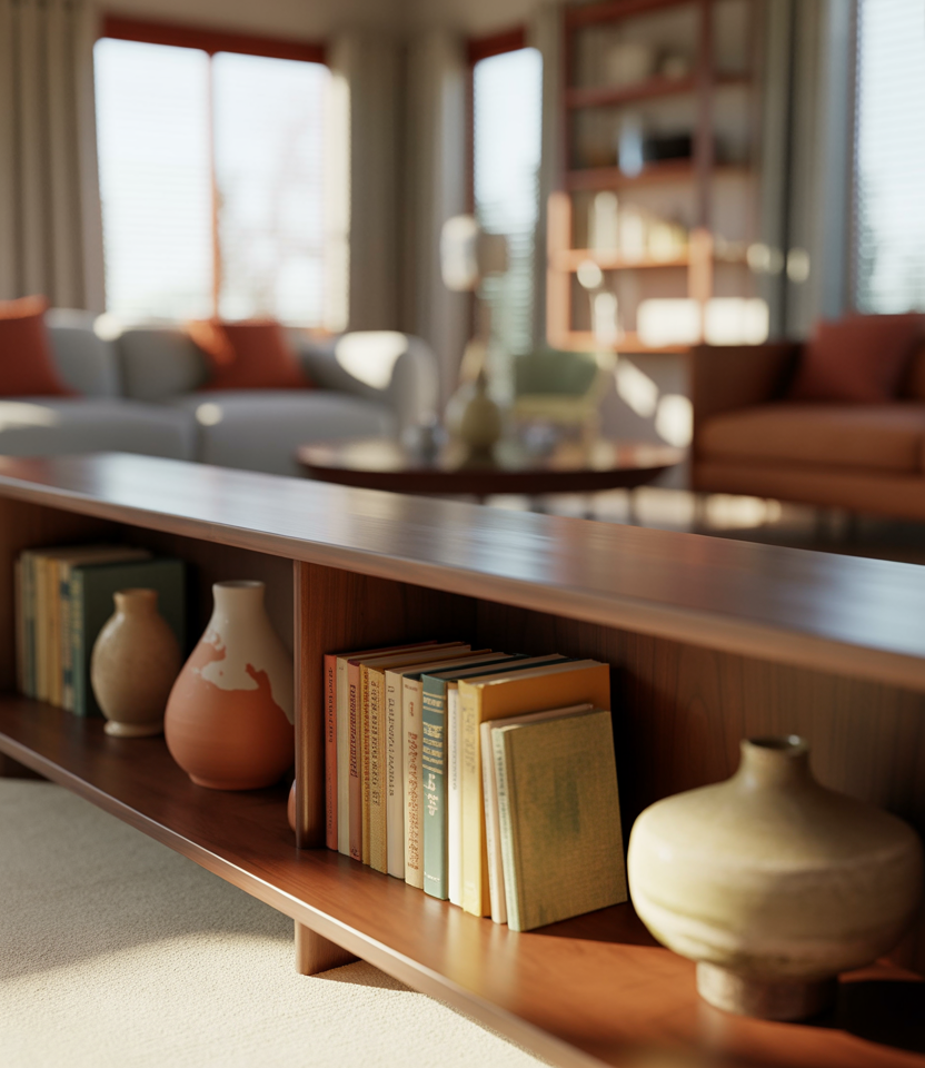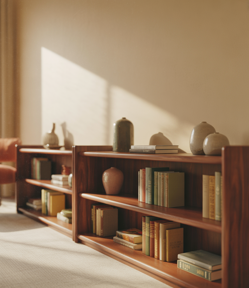 Short, low bookcases inspired by mid-century modern design are gaining ground in 2026. Often labeled MCM, these pieces favor horizontal lines and warm woods. They sit comfortably beneath art or windows, blending storage with a relaxed, furniture-like presence.