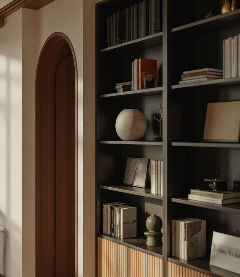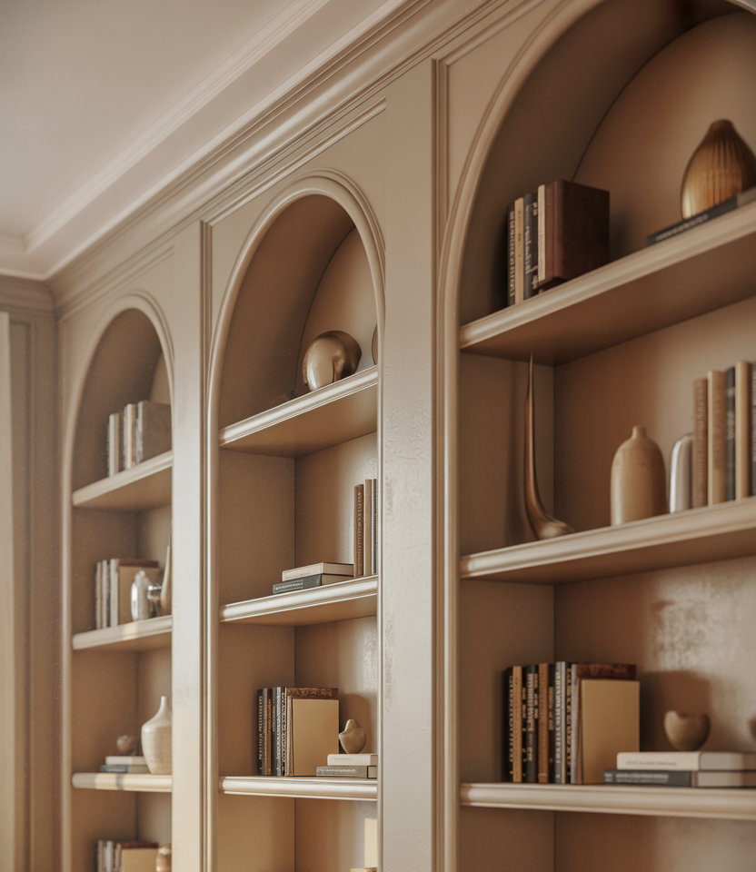 Arched shelving is shaping one of 2026’s most architectural bookshelf trends. When built in, these curves soften walls and bring character to otherwise plain rooms. Finished in a neutral palette, they bridge classic and contemporary styles, especially in living rooms and dining spaces.