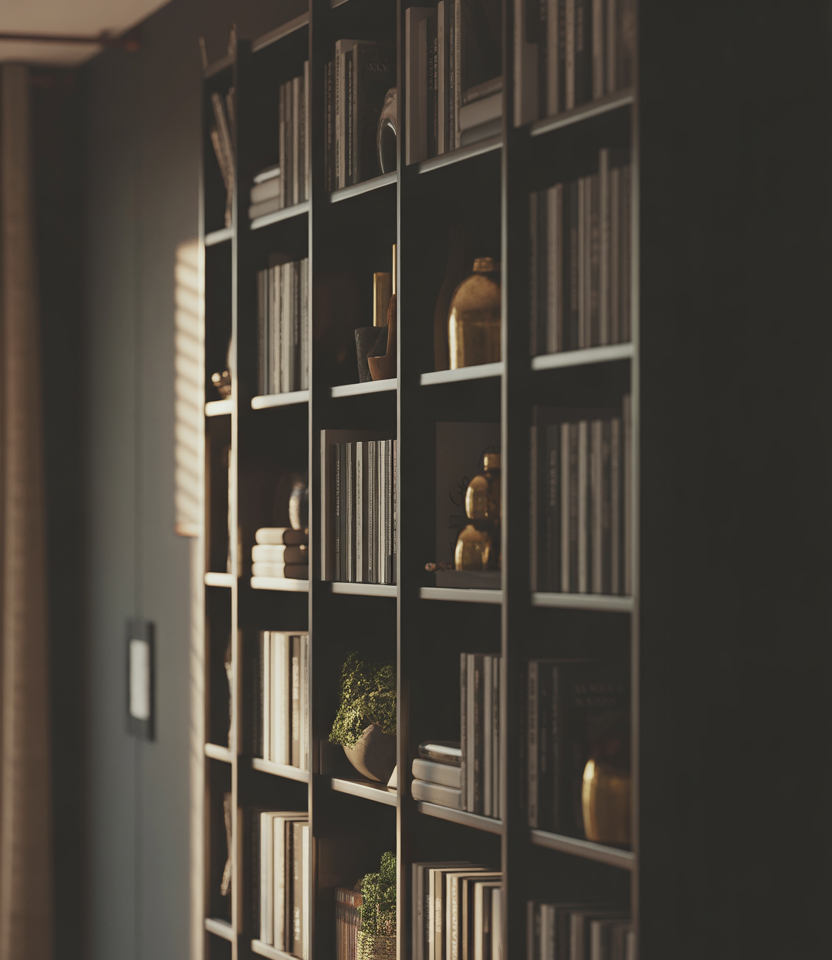 In 2026, dark, open shelving is leaning even more to the library-inspired look, where atmosphere and accessibility seamlessly combine. Intimacy is created in the space with the deep finishes and the presence of books, but a formality is absent. This particularly suits home offices or reading nooks.