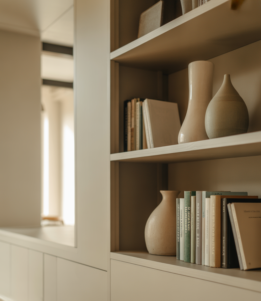 Built-in shelving continues to feel timeless in 2026, especially when finished to match surrounding walls. Often kept neutral or softly white, these shelves fade into the architecture while still showcasing personal collections. The effect is seamless and quietly polished.