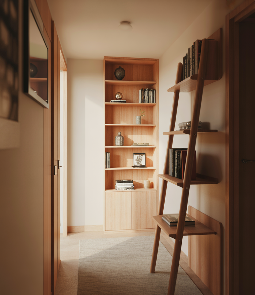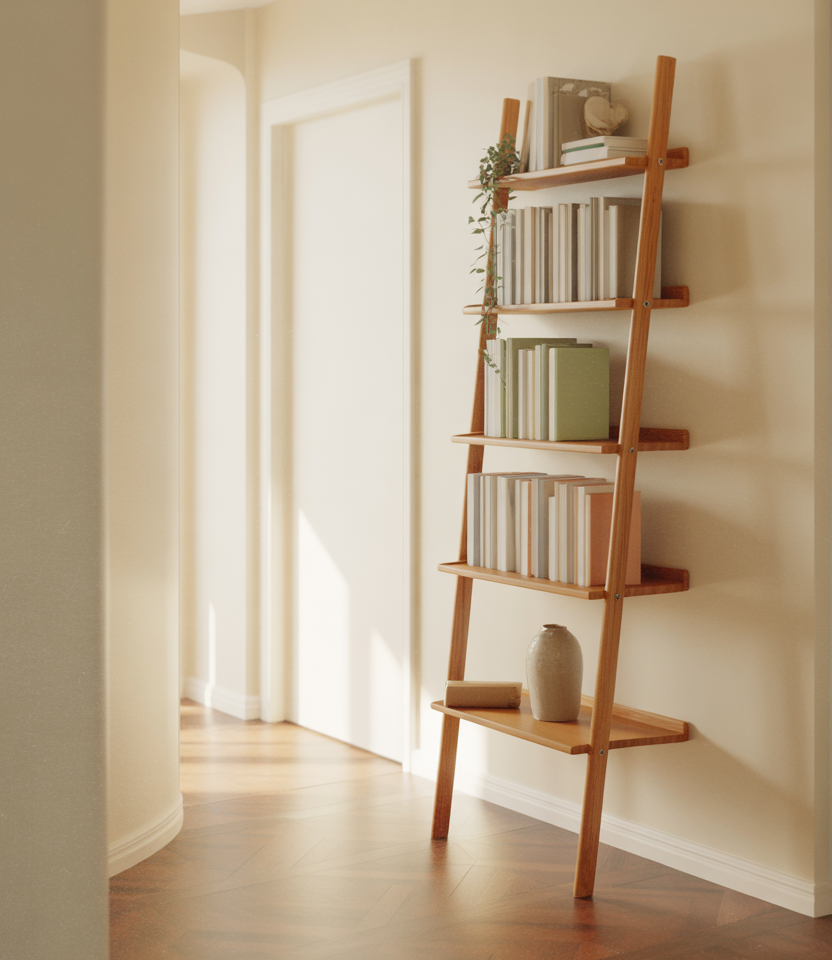 Ladder shelves remain popular in 2026 for their light footprint and visual lift. In narrow rooms or hallways, a long, leaning profile offers storage without closing in the space. These shelves work especially well when styled sparsely, letting the wall show through and keeping the look airy.
