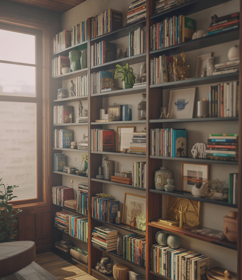 An eclectic bookshelf thrives on contrast, mixing art, objects, and books in a way that feels personal rather than styled once and frozen. In 2026, open shelving leans toward looser arrangements, where spines face different directions and objects overlap naturally. The look suits living rooms and home offices where personality matters more than symmetry.