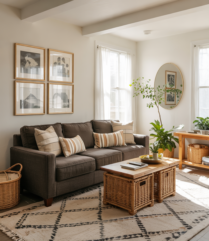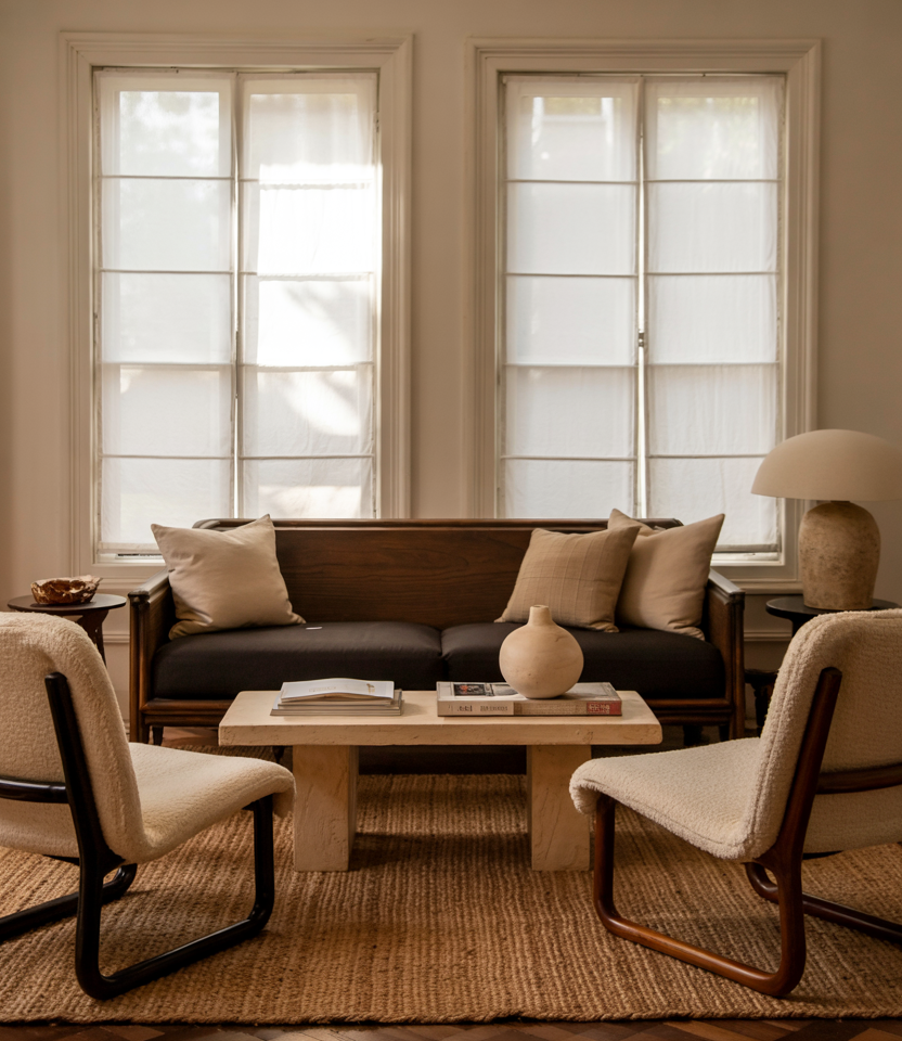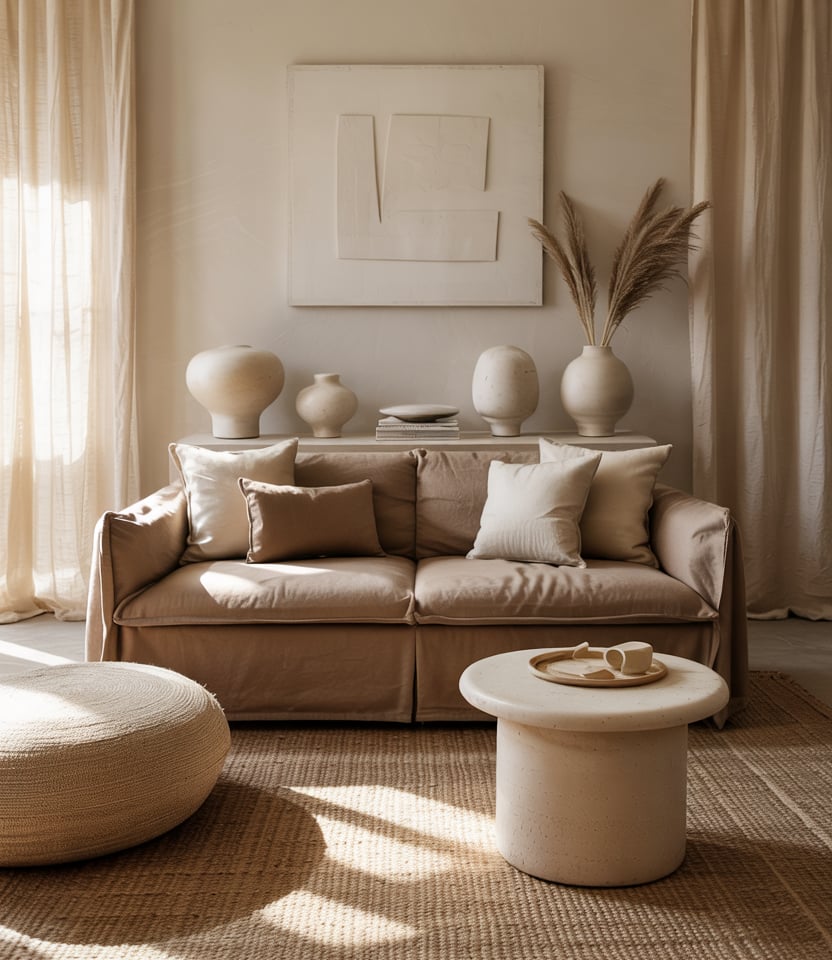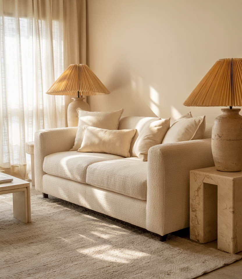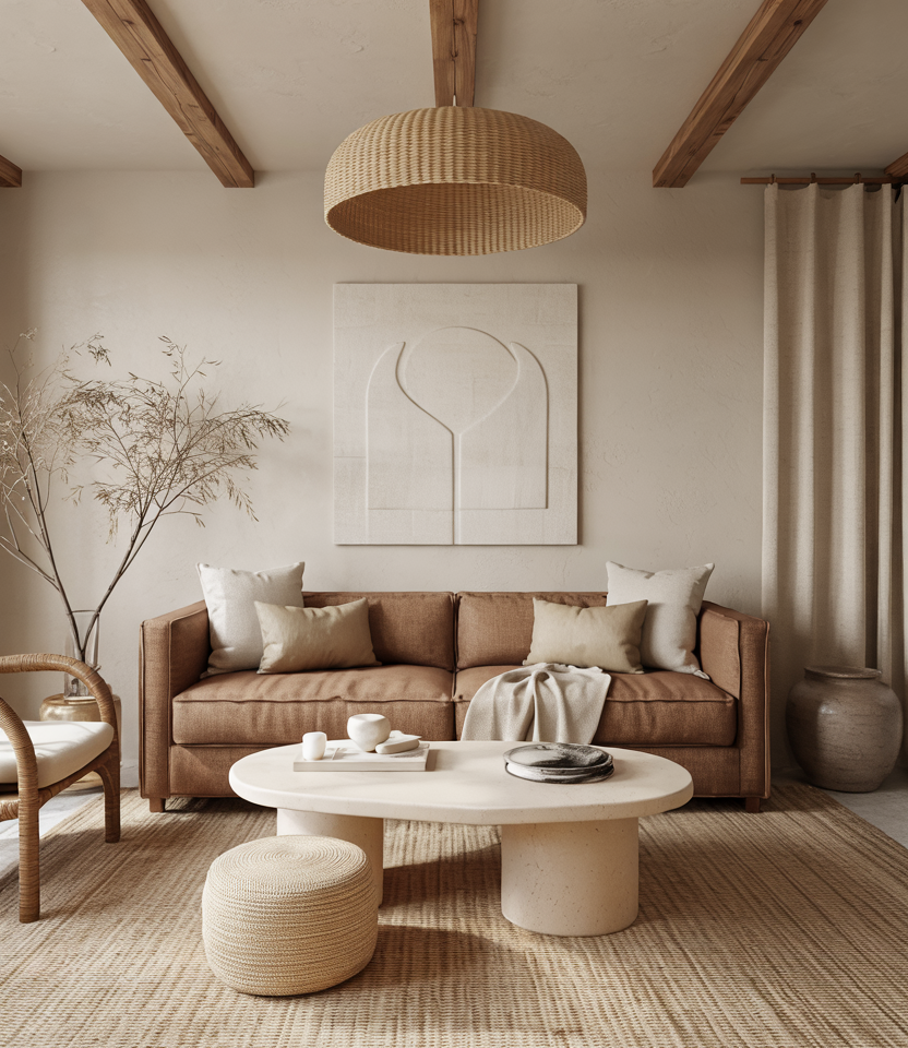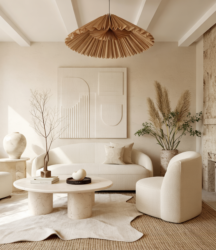 If stark white feels cold, go for Cream and brown. Buttery paint, boucle furniture, and a plush rug create a soft-focus frame for daily life. Decor ideas such as pleated lampshades and travertine bowls keep it interesting without noise. For rentals, swap in creamy slipcovers and paper shades; you get the look without repainting walls. It’s warm minimalism—less about stuff, more about feel.