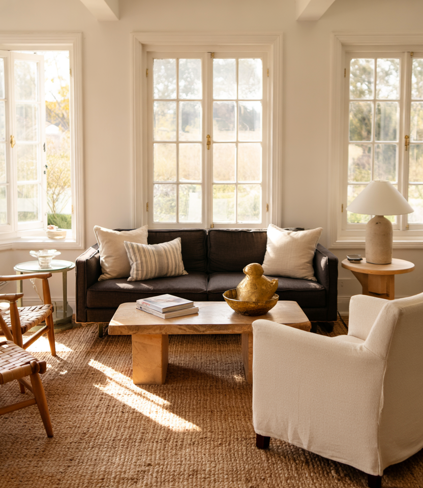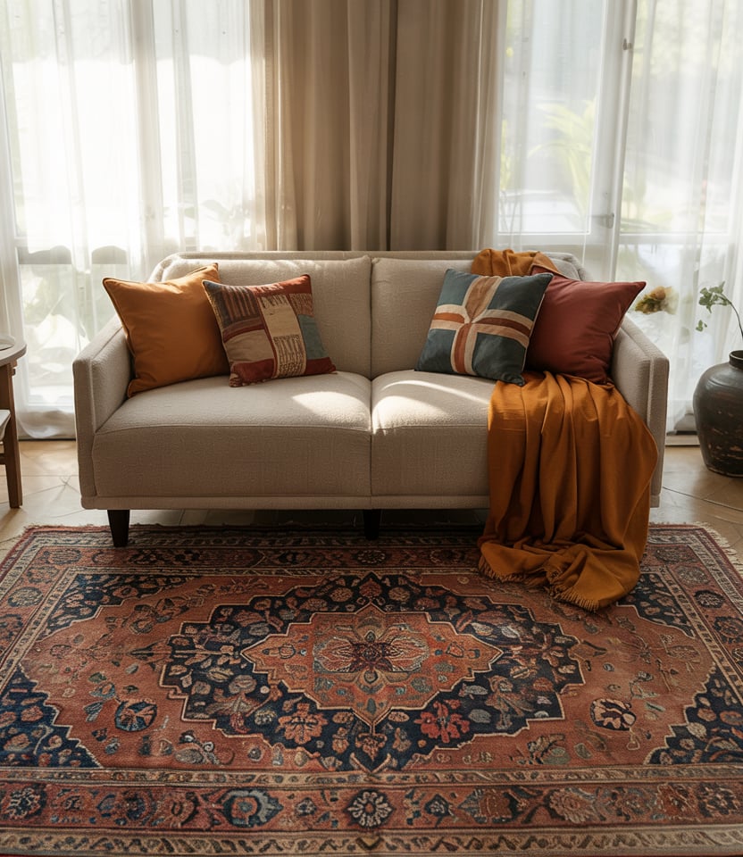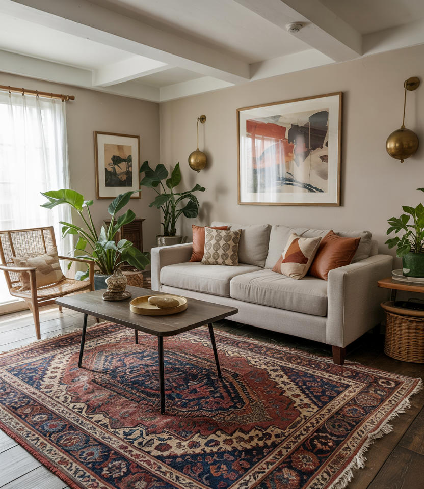 If your brown needs taming, a statement rug is your best bet. Choose a vintage Persian rug in shades of cocoa, rust, and teal and then repeat one of the colors in your decor and furniture. Keep walls light so the pattern can breathe, or go full-on dark with paint for high drama. These decorating ideas work wonders in open-plan spaces by defining different zones. If you’re unsure about size, go on the bigger side; as Emily Henderson says, an undersized rug will visually shrink your room.