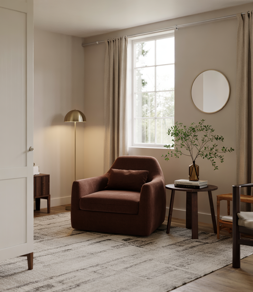 In tight rooms, armless chairs work well, and so does leggy furniture and vertical decor ideas, tall lamps included. Keep walls mid-tone brown so that the perimeter disappears-a visual square-footage trick. Choose a low-pile rug and tone-on-tone paint to keep everything flowing. Anecdote: a 400-sq-ft studio felt bigger after swapping bulky arms for a slipper chair.