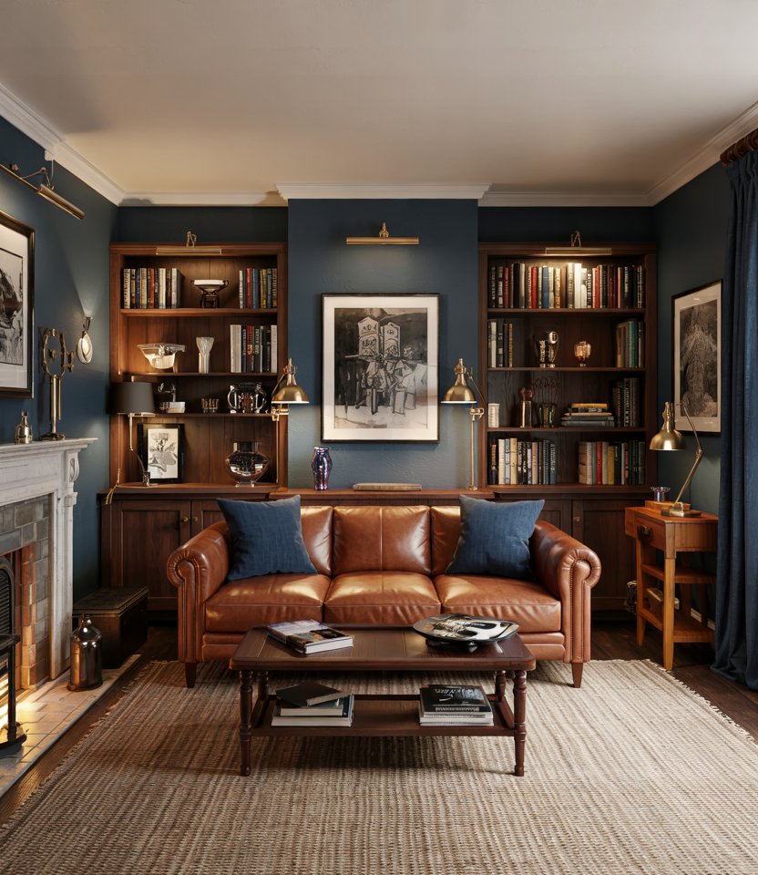 Navy Blue textiles together with Walnut create a library-chic vibe. A tufted bench, tailored furniture, and pinstripe rug add structure, while inky blue paint grounds the walls. These decor ideas are collegiate in the best way-smart yet somewhat nostalgic. Add leather-bound books or framed scores; it’s a conversation-friendly look for row houses or condos.
