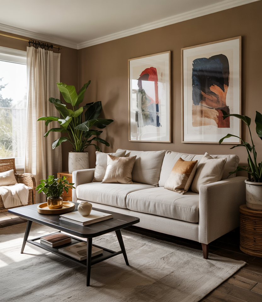 A sand-to-cocoa gradient feels very easy on the eyes and sits well with renters. Layer Beige and brown with tonal paints, a wool rug, and relaxed furniture shapes. The aesthetic leans toward spas, suitable for apartments with a glare from the afternoon sun. Go with low-contrast decor ideas—flax linen, oat ceramics—so the walls go to the background. It’s the perfect move in a calming color scheme I prescribe to clients looking for calm without gray. Bonus: tonal rooms hide scuffs better than pure white-if you need an excuse for criticism-worthy children’s or pet’s marks.