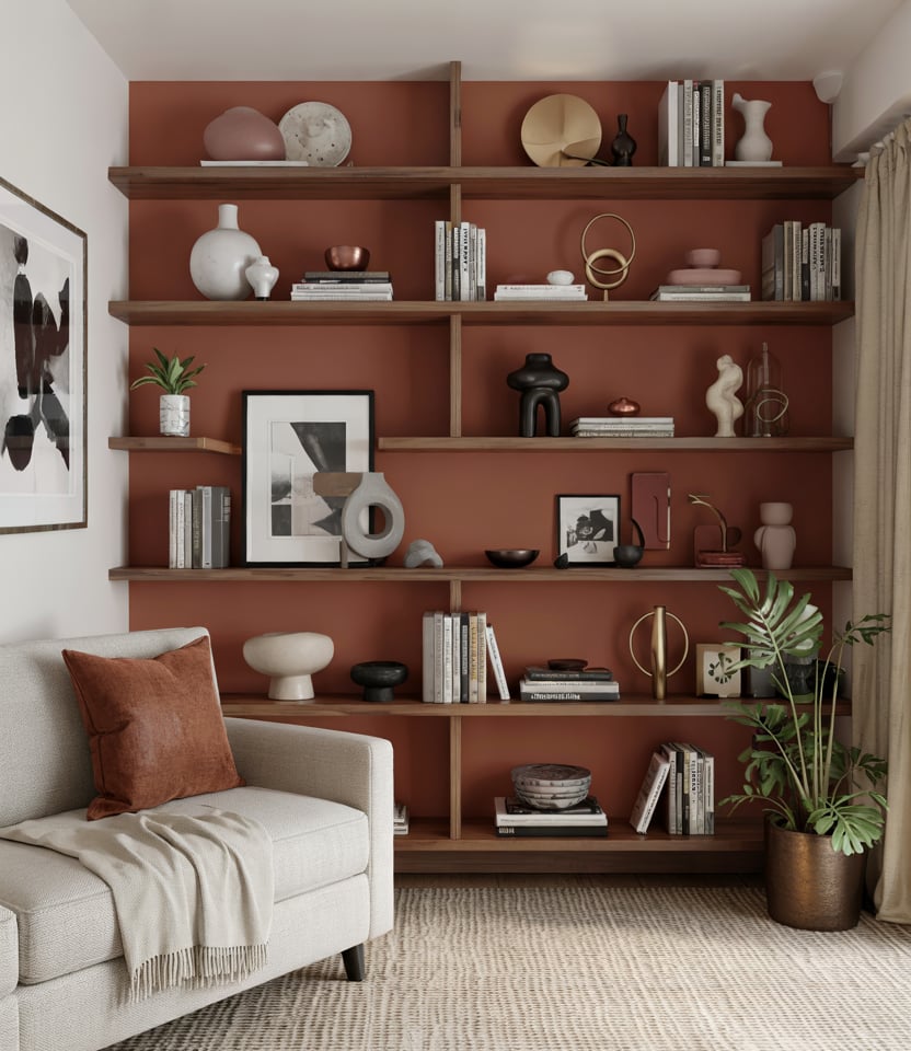 Shelves make the difference between bland and curated. Use odd numbers, vary heights, and echo colors found in your rug or artwork. Paint back walls a few shades deeper to add visual depth. Rotate items seasonally: books, bowls, a branch, etc., while giving each piece some breathing room. It’s one of those simple decor ideas that’ll make your space look like a designer dropped by-between meetings.
