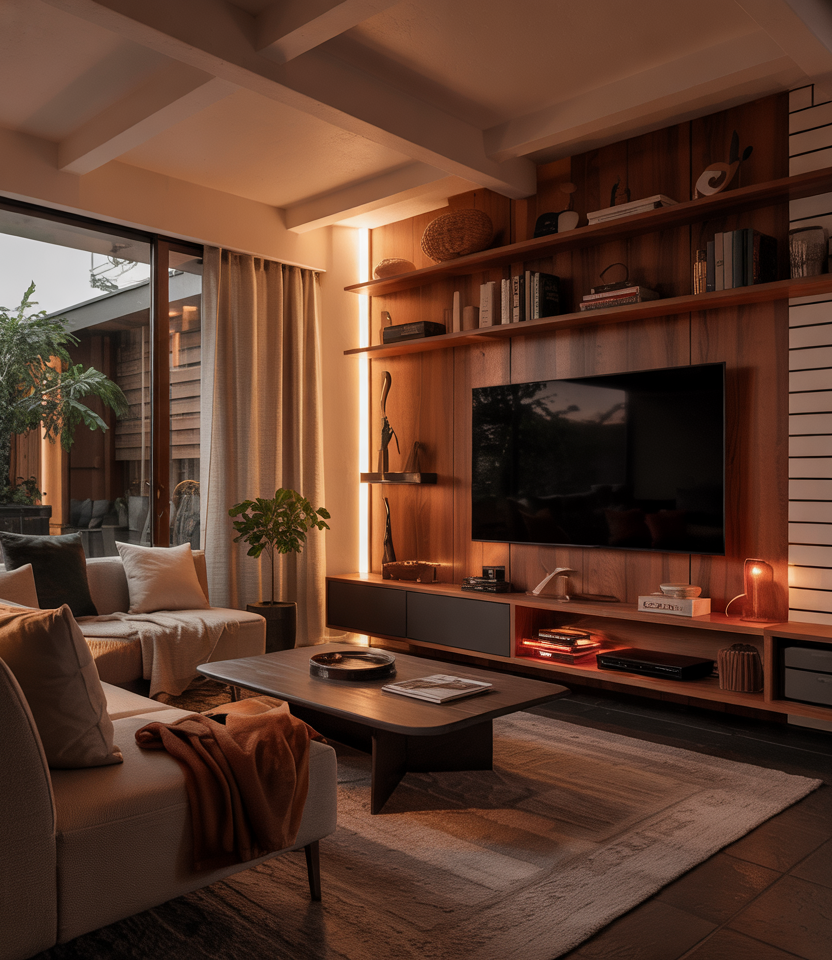 Hide screens in walnut, add cord control, and pick smart bulbs that shift warm in the evening. Brown cabinetry keeps tech from stealing the show. A dense rug absorbs sound; soft paint and discreet décor keep the vibe human-first. This aesthetic suits open plans where work, play, and streaming mingle.
