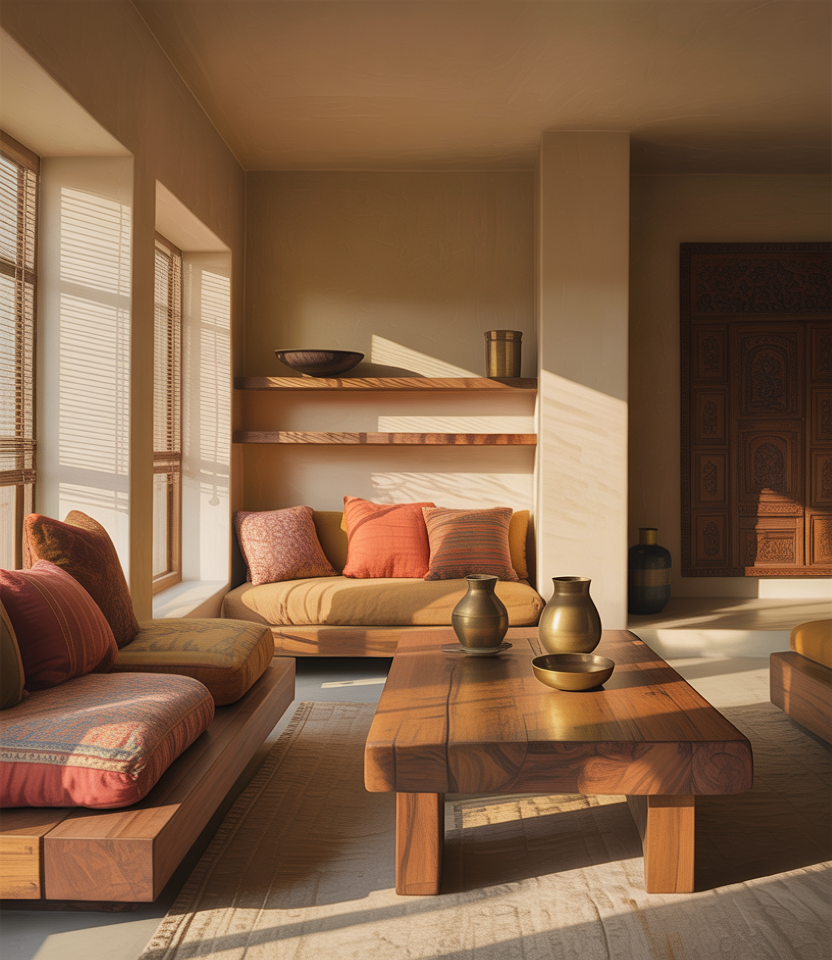 This contemporary living room draws inspiration from Indian interiors while staying firmly modern. Warm wood, low seating, and layered textiles add depth without visual heaviness. Subtle patterns, earthy tones, and sculptural décor bring cultural richness into a clean-lined space. The balance feels intentional, offering character without overwhelming the contemporary framework.